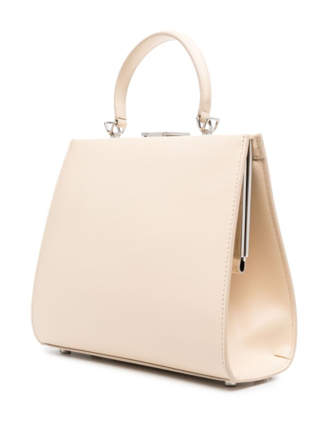 Бело-желтый, телячья кожа, серебристый металлический логотип, нашивка с логотипом внутри, металлические ножки, застежка на зажиме, закругленная верхняя ручка, съемный ремень на плечо, основное отделение и внутренний карман на молнии.