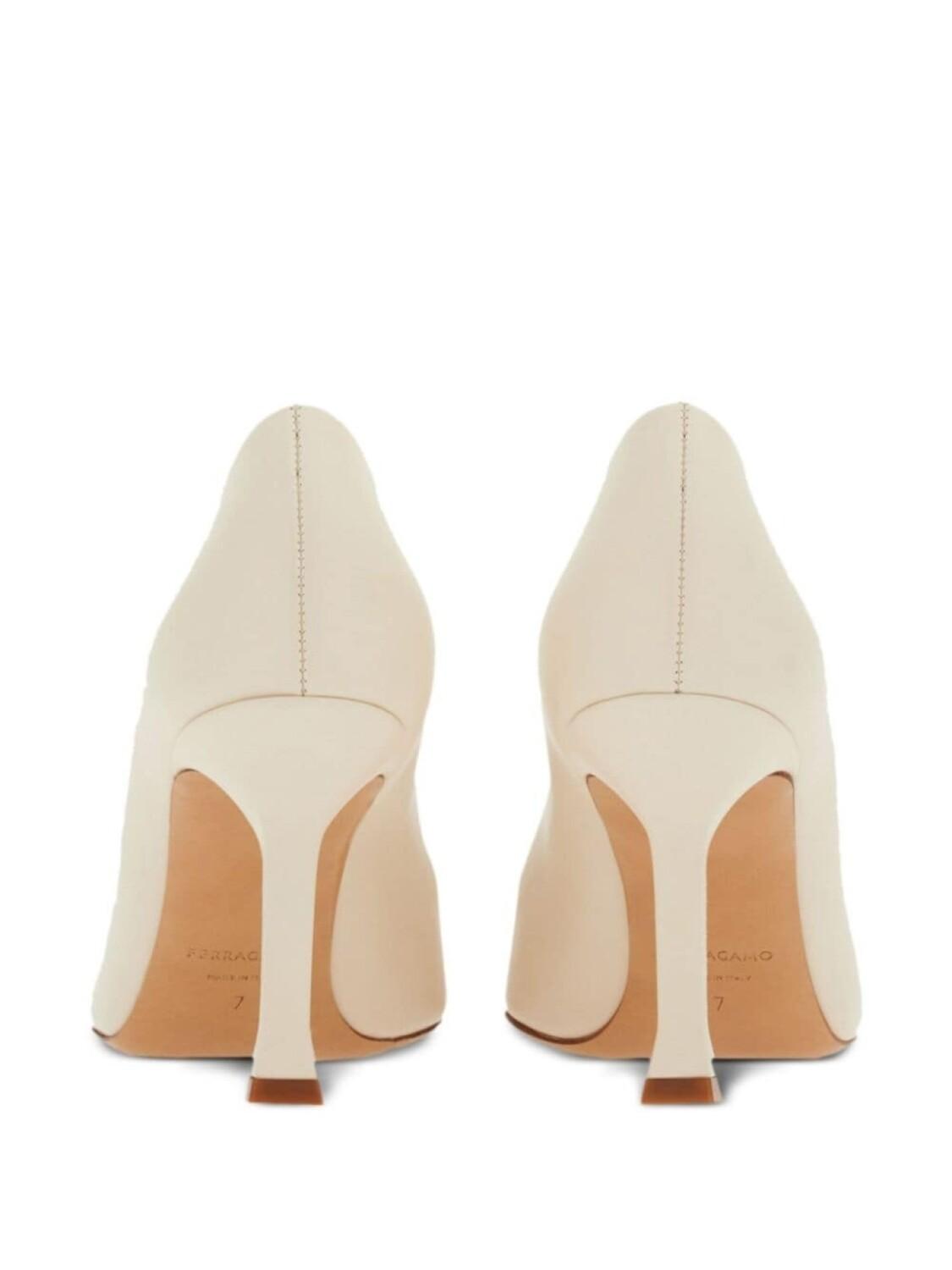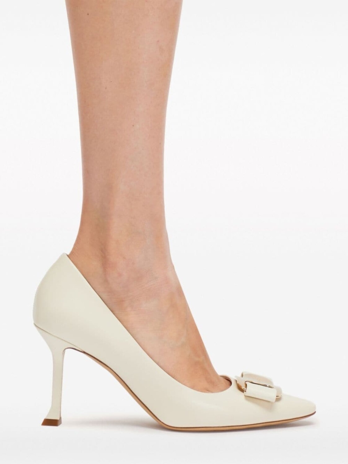 Белый, овечья кожа, гладкая текстура кожи, заостренный носок, бант, золотистая фурнитура, кожаная стелька с логотипом, высокий каблук и кожаная подошва.