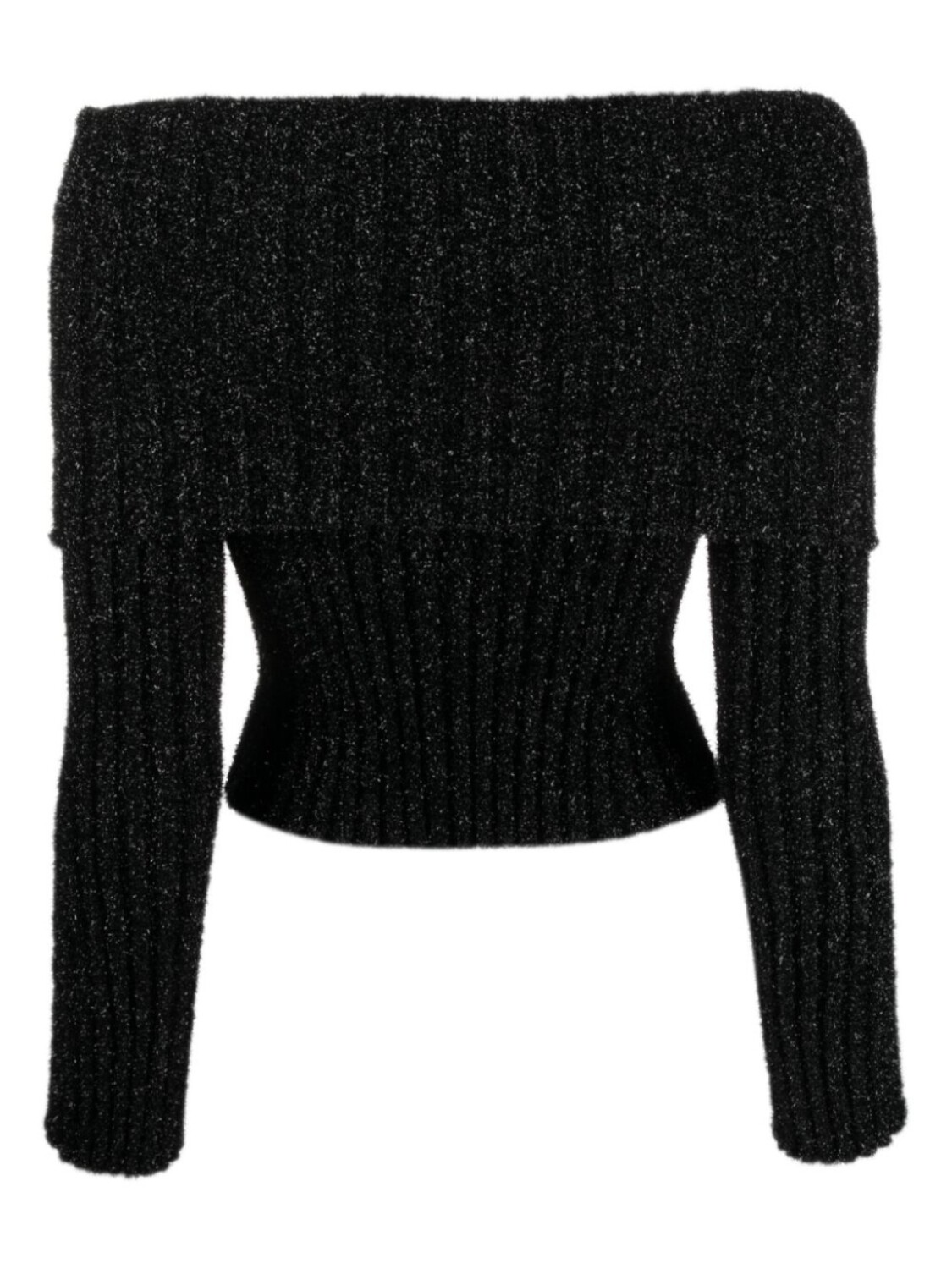 Черный, трикотаж в рубчик, вставки из люрекса, блестящий материал, укороченная длина, открытые плечи, завязки спереди и длинные рукава.