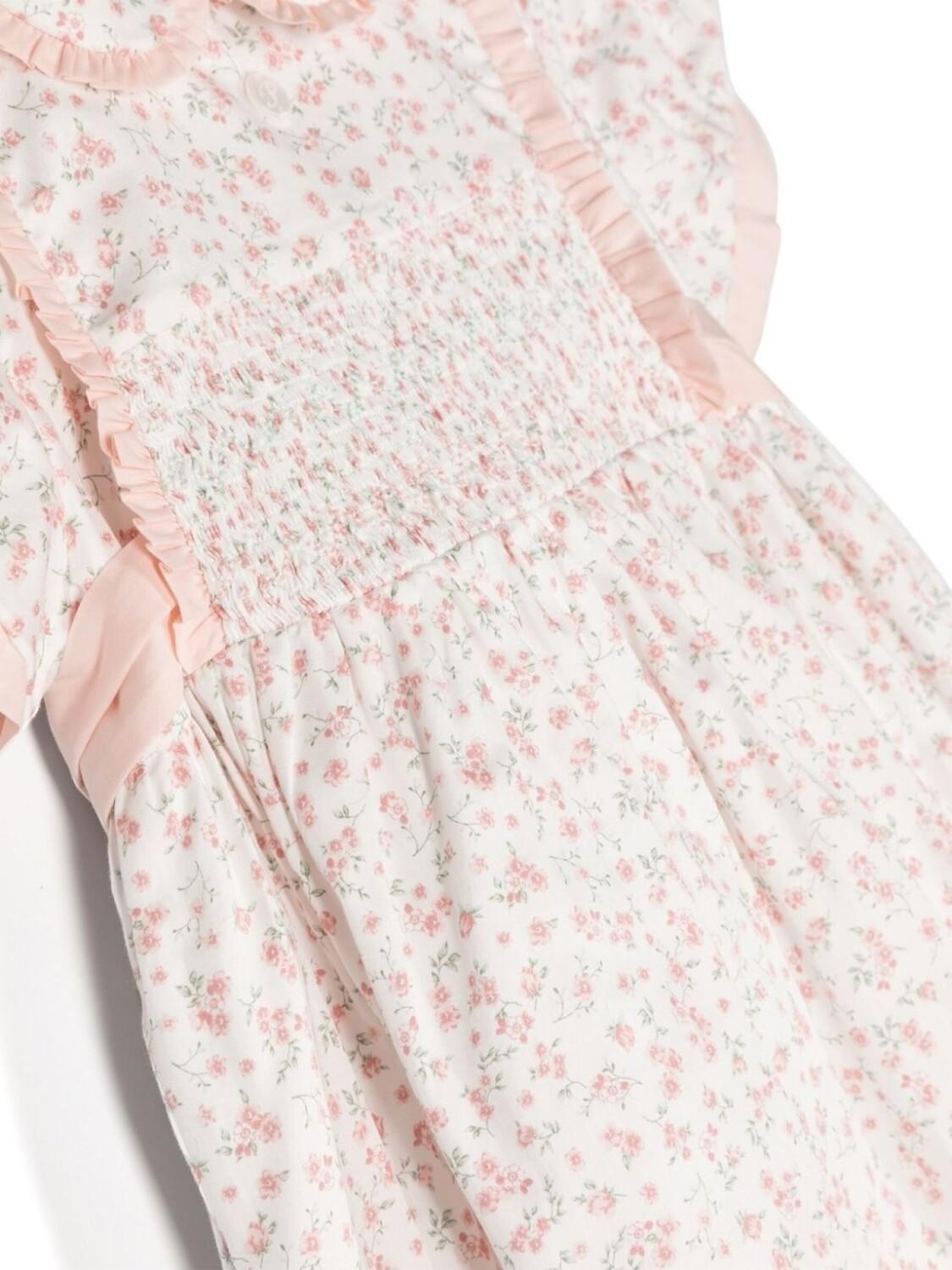 Кораллово-розовый, белый, хлопок, цветочный принт, контрастная отделка, вставки с оборками, завязка на бант сзади, потайная застежка на молнии сзади, воротник Питер Пэн, сборка на талии, короткие объемные рукава и расклешенная юбка.
