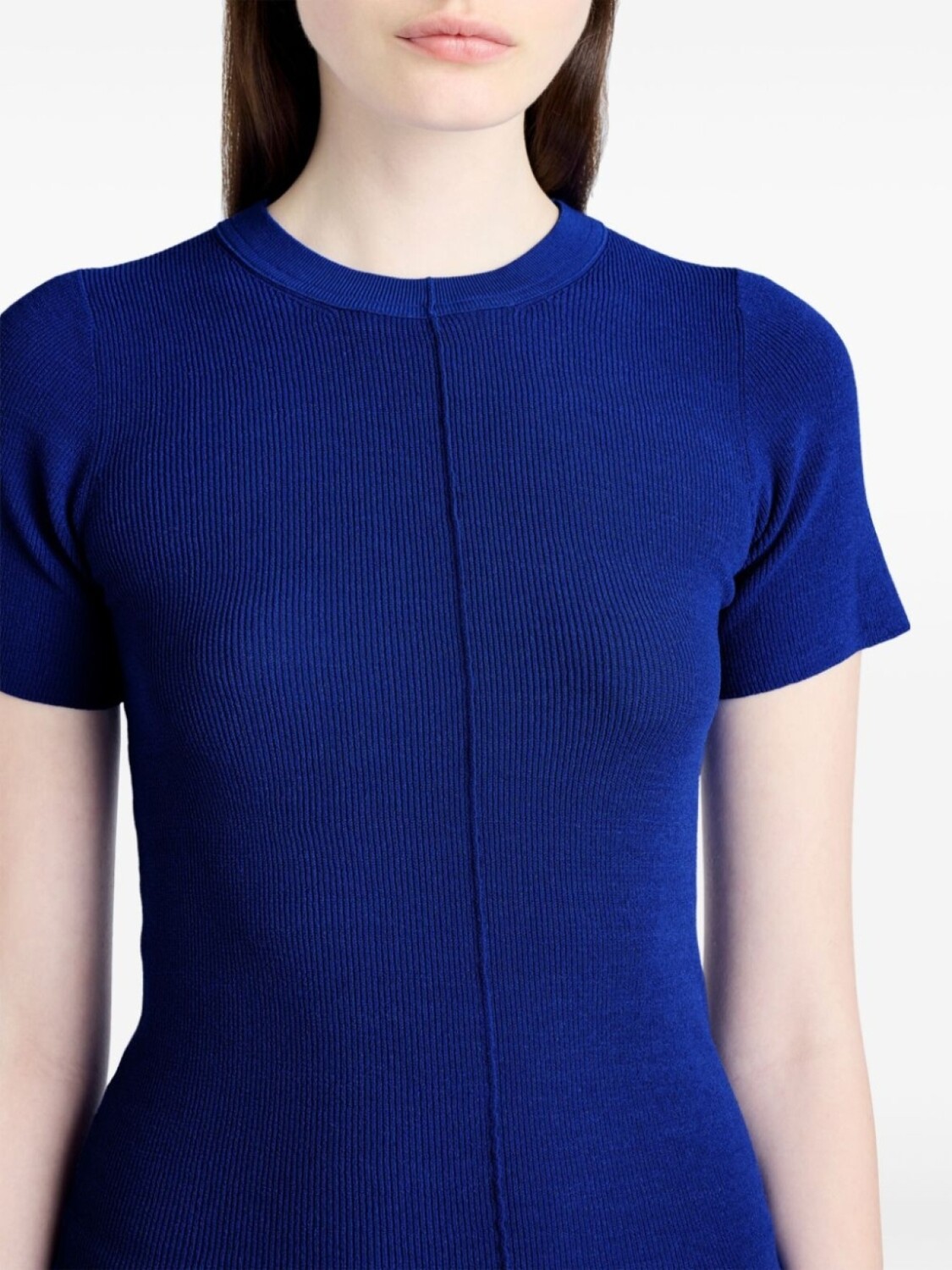 Кобальтово-синий ребристый трикотажный шов, декоративный круглый вырез, короткие рукава, прямой подол