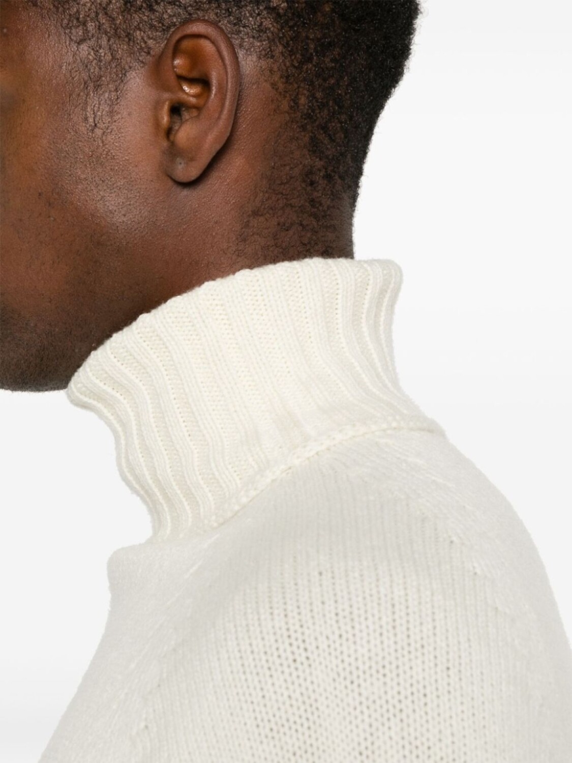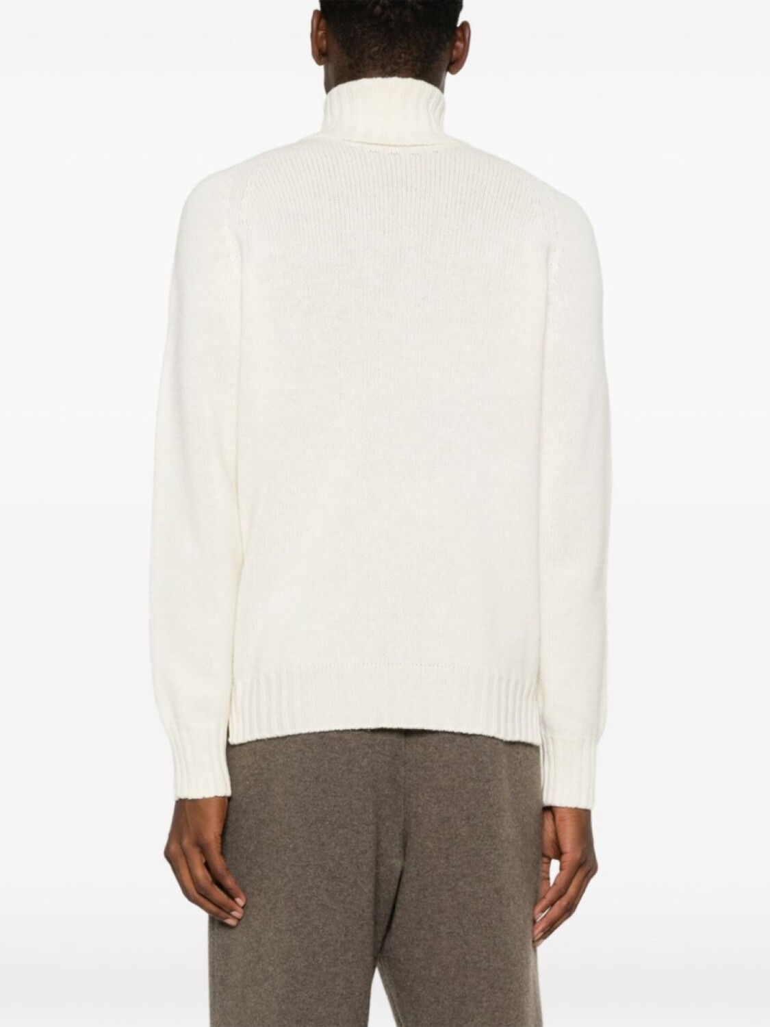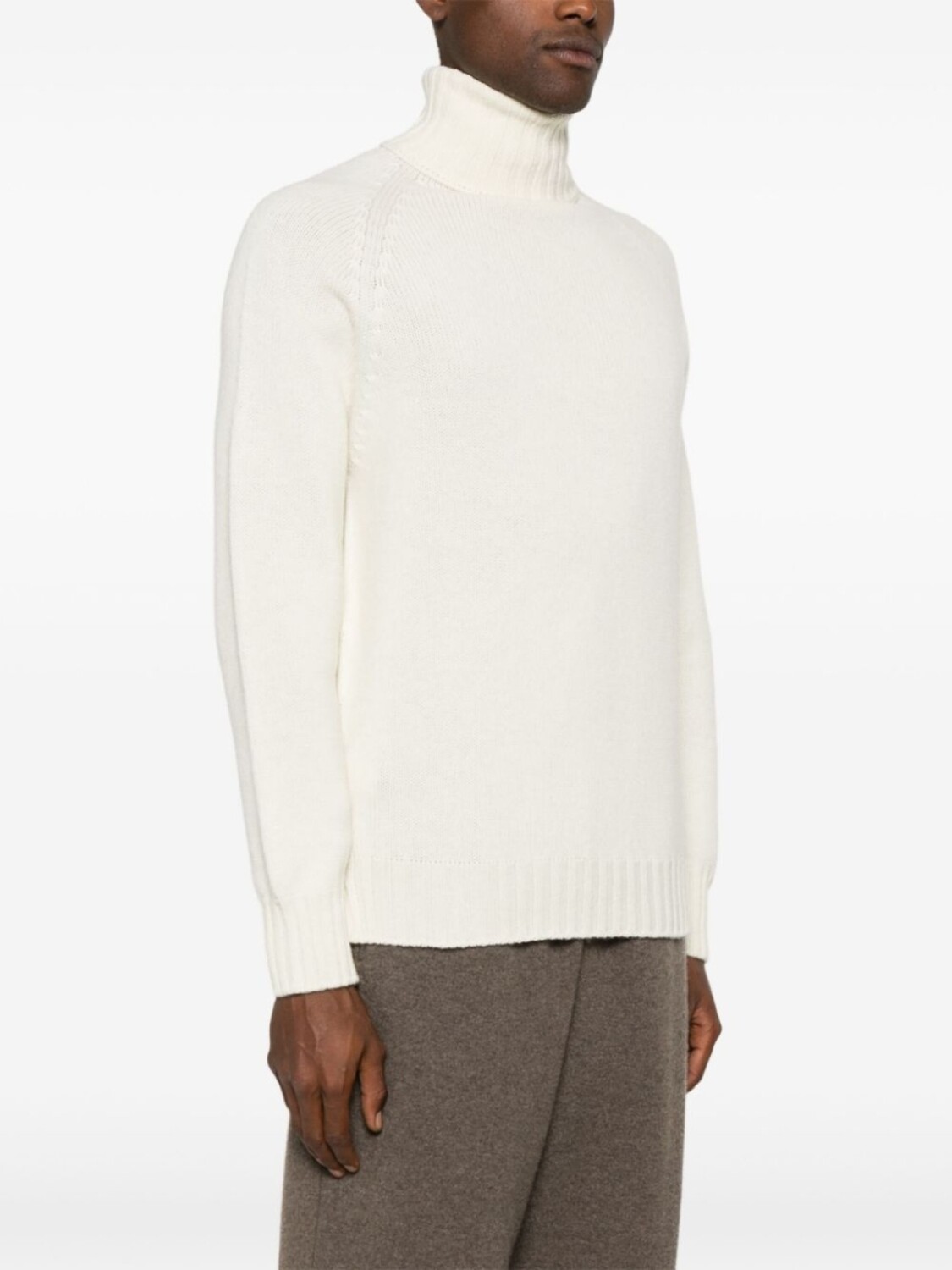Белый, смесовая шерсть, трикотаж в рубчик, высокий воротник, длинные рукава реглан, разрезы по бокам, подол и манжеты в рубчик, прямой подол