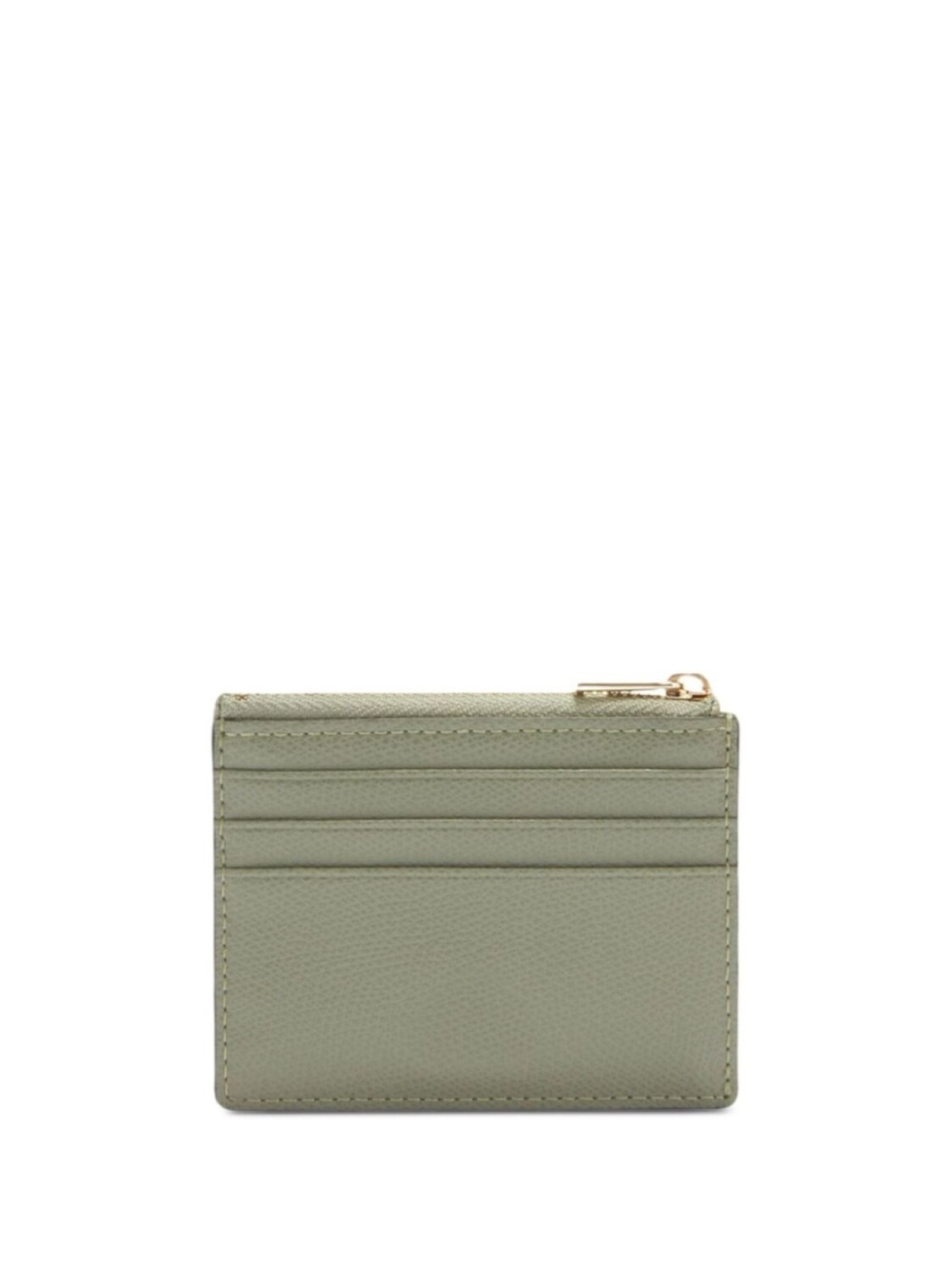 Светло-зеленая застежка-молния сверху, отделения для карточек, отделения для карточек сзади, золотистые буквы логотипа