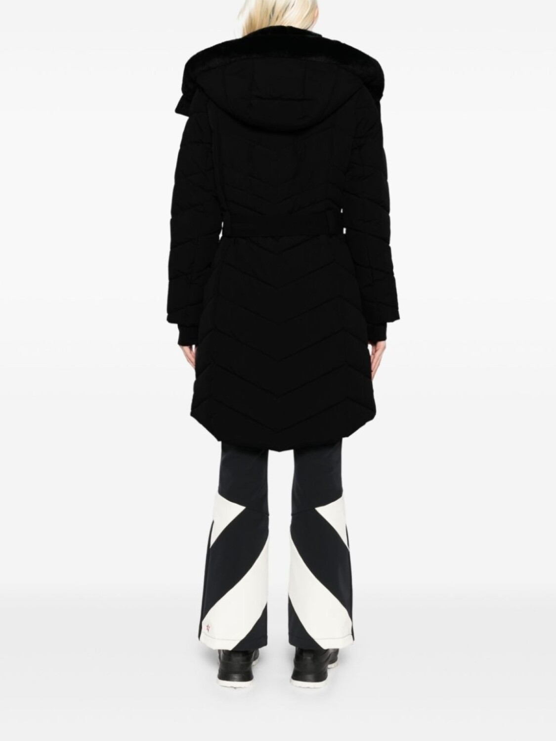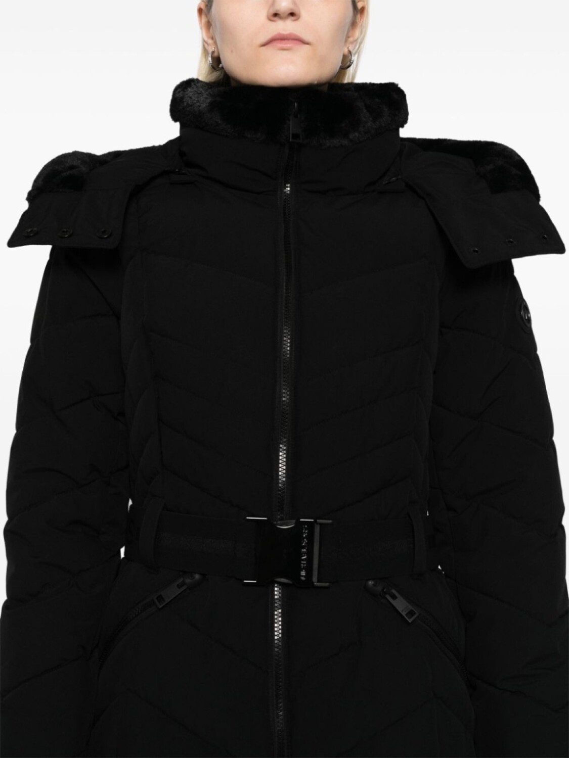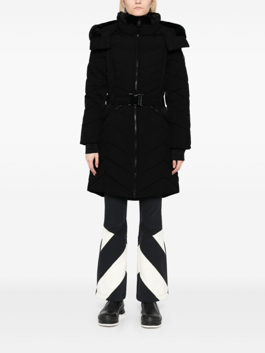 Черный, капюшон с оторочкой из искусственного меха, двусторонняя молния спереди, два кармана на молнии, съемный пояс