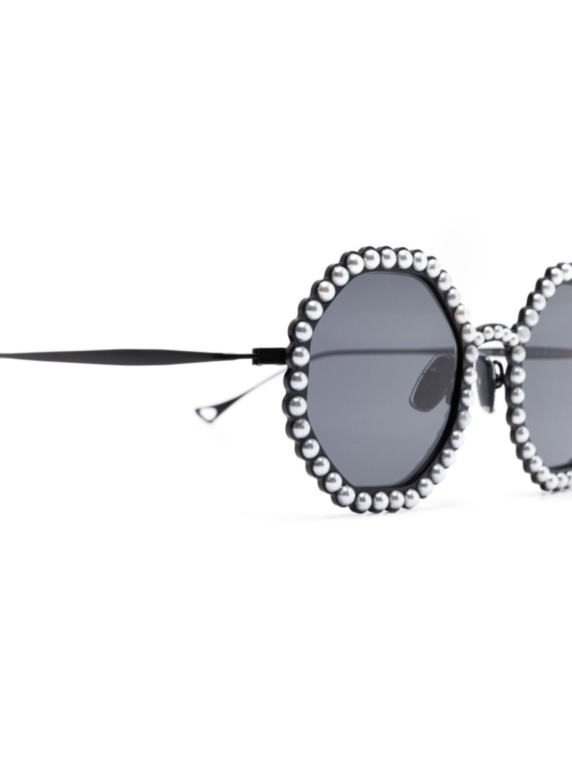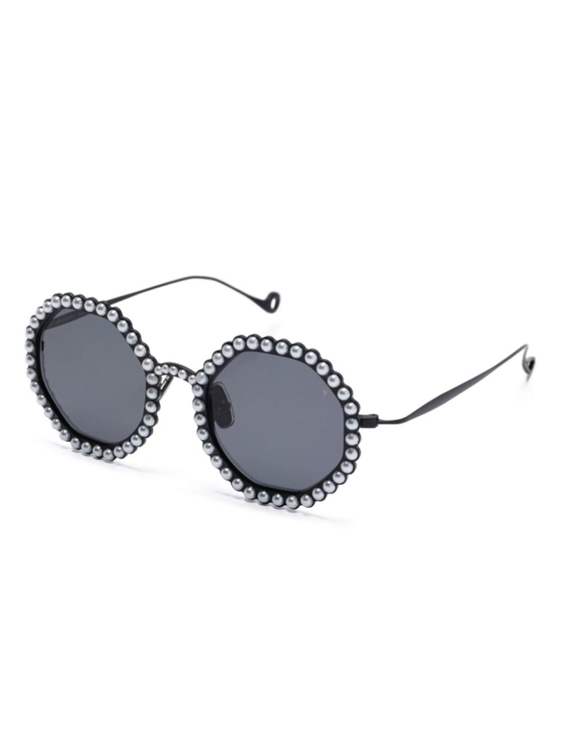 Черный, круглая оправа, декор из искусственного жемчуга, серые линзы, прямые дужки, дужки с закругленными концами, носоупоры, В комплект входит защитный чехол для очков.
