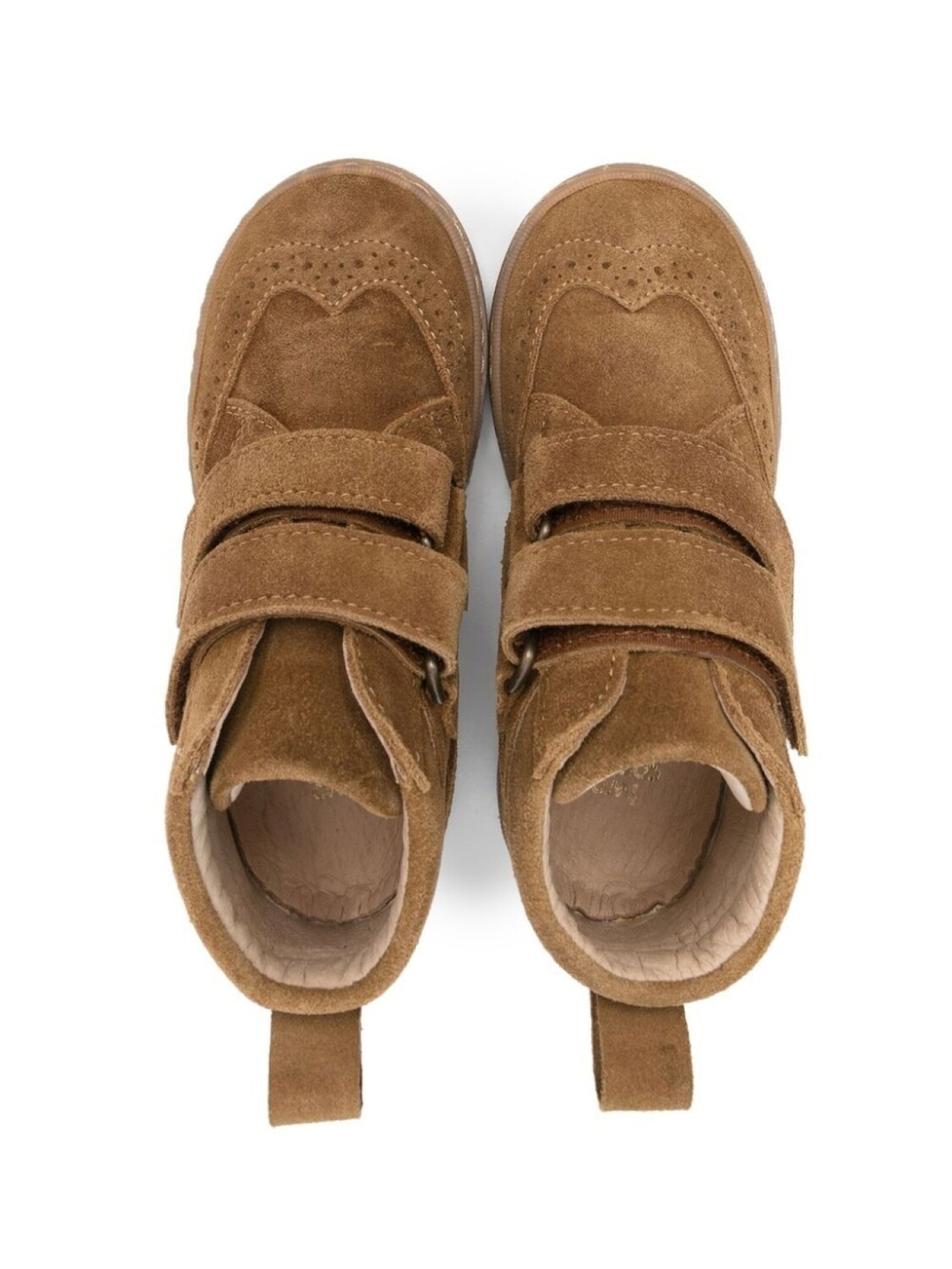Расцветка Tobacco Brown, замша из телячьей кожи, телячья кожа, перфорация, браслет в два оборота, застежка на липучке спереди, петля для подтягивания сзади, закругленный носок, плоская резиновая подошва и высота по щиколотку.