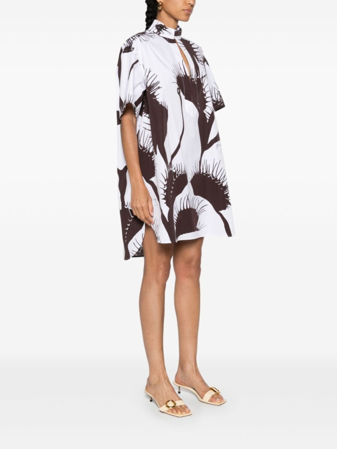 Кафтан из свежего хлопкового поплина с новым принтом «Венера». Воротник-стойка на пуговицах дополняет свободный крой и рукава, а глубокий V-образный вырез воплощает чувственную привлекательность лета.