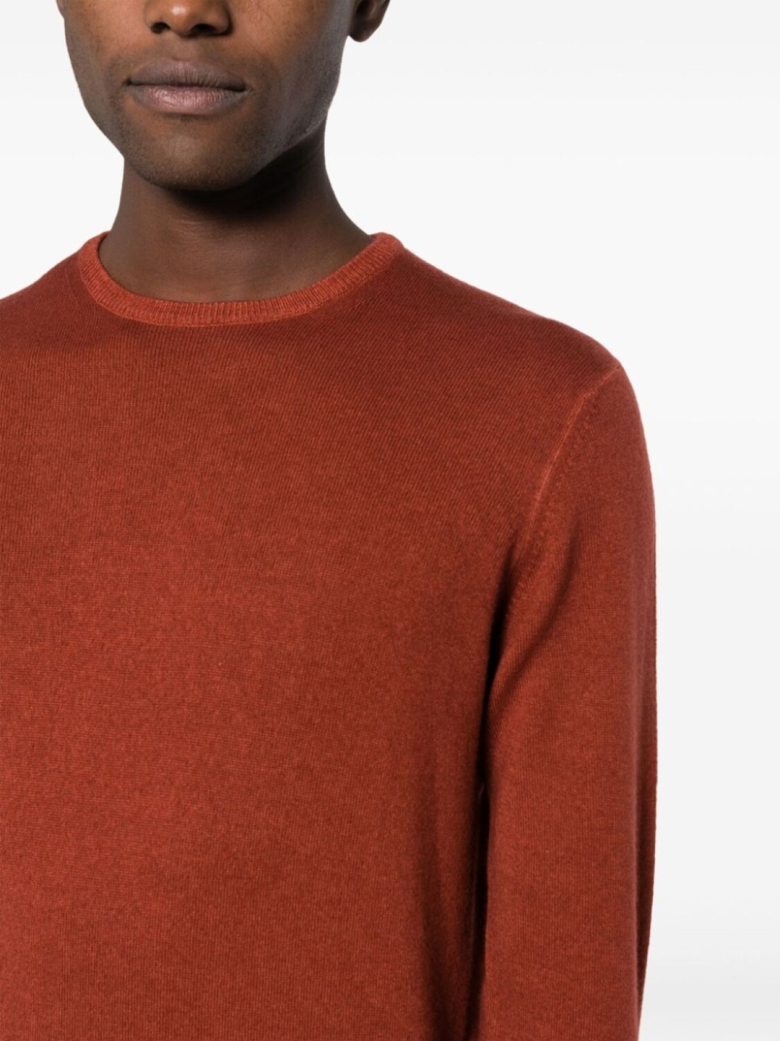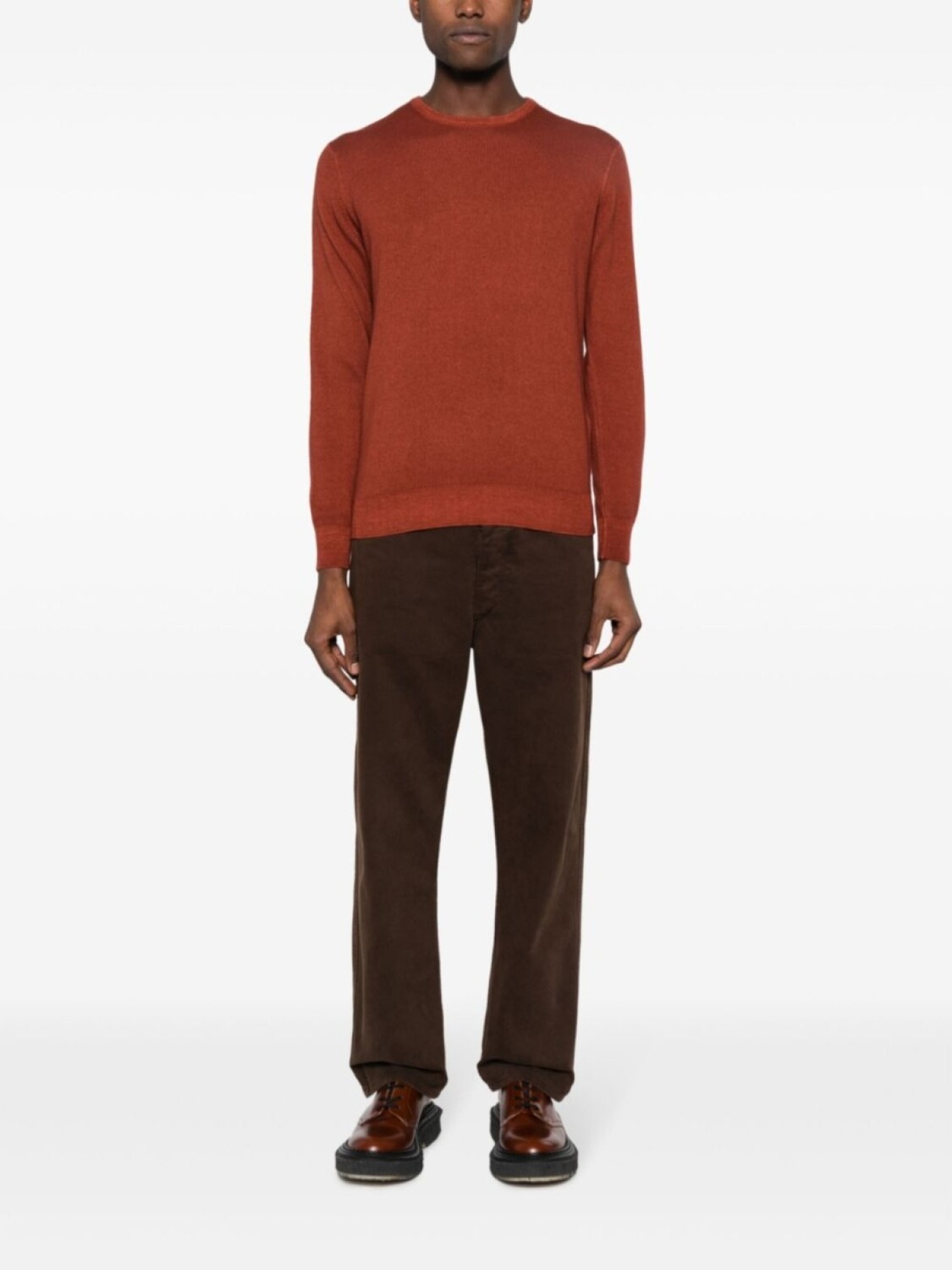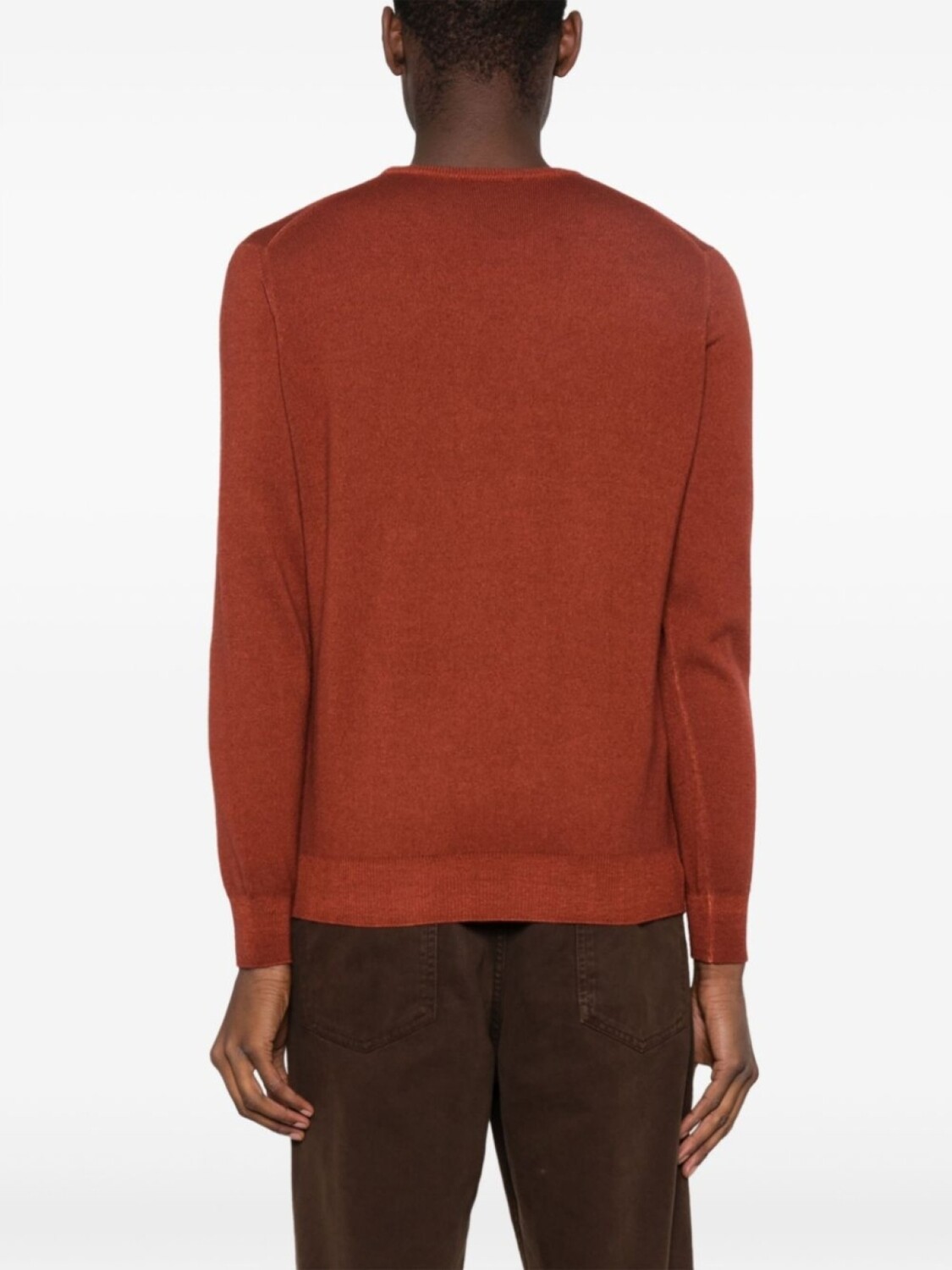 Темно-оранжевый, шерсть мериноса, вязаные края в рубчик, круглый вырез, длинные рукава и прямой подол.