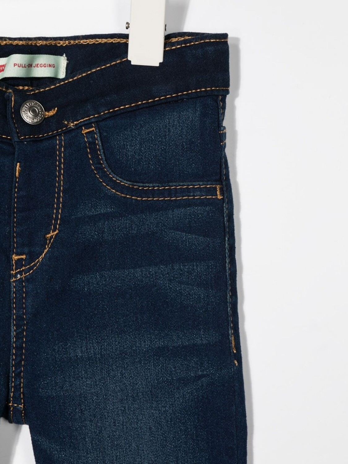 Эффект потертости, контрастная строчка, петли для ремня, застежка на молнии и пуговице спереди и классическая пятикарманная модель.