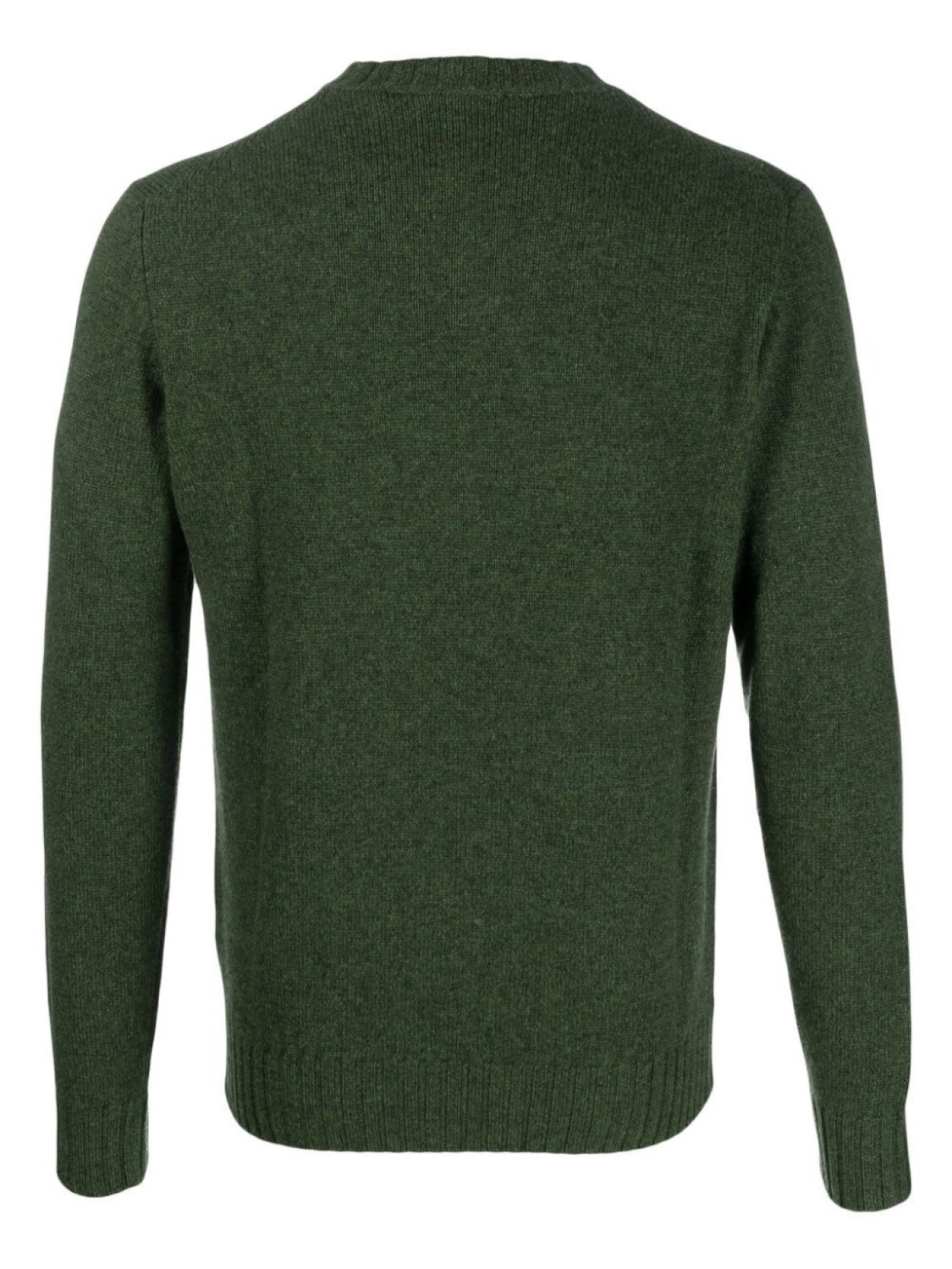 Темно-зеленый, кашемир, меланжевая пряжа, отделка в рубчик, круглый вырез, длинные рукава и прямой подол.