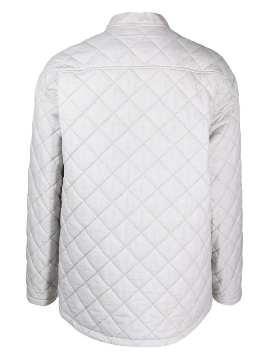 Светло-серый, стеганая модель, нашивка с логотипом на груди, плоский заостренный воротник, застежка на кнопках спереди, длинные рукава, нагрудный накладной карман и два прорезных кармана на пуговицах спереди.