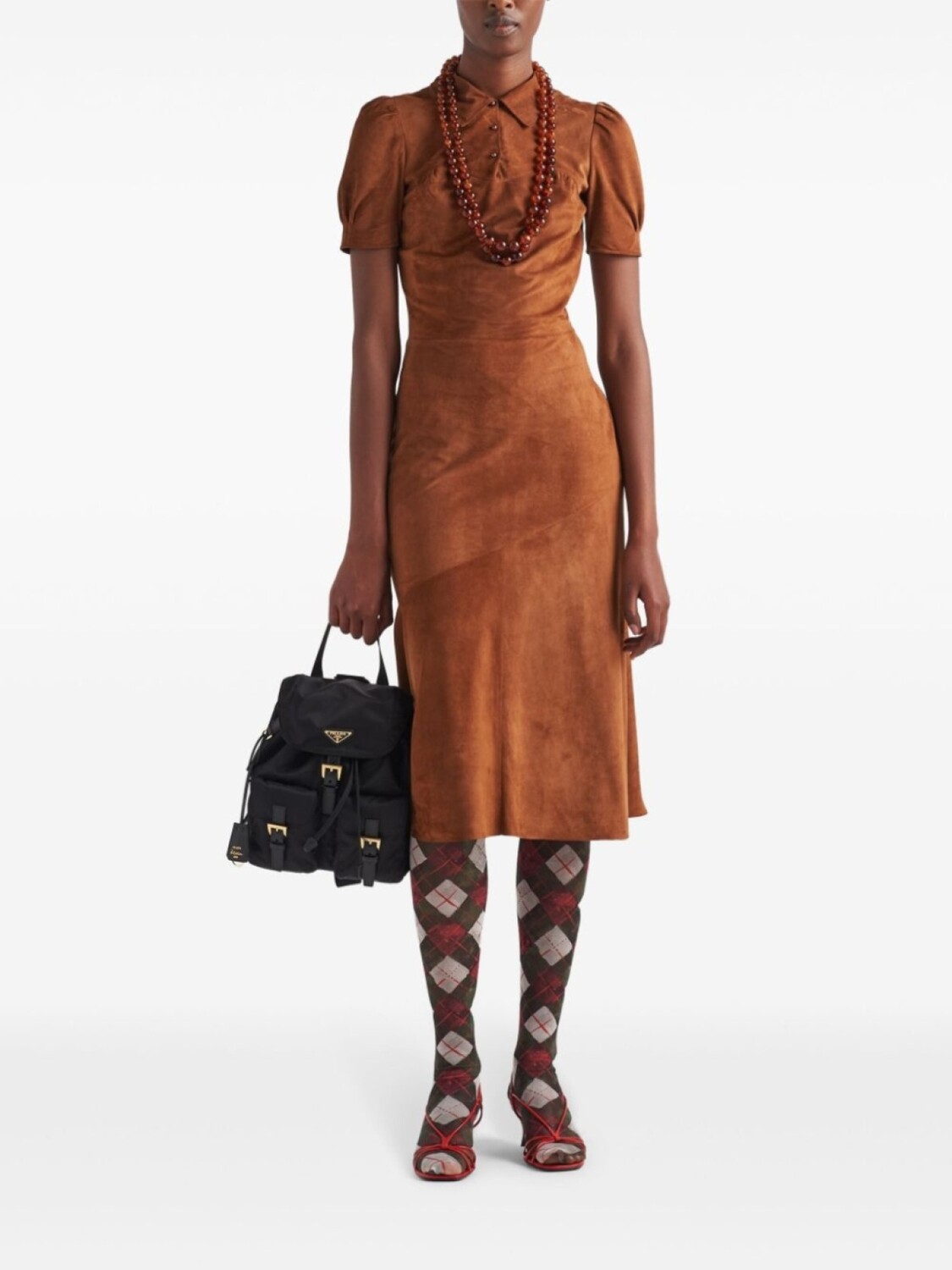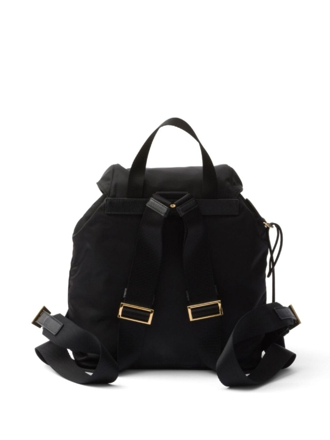 Черная кожаная отделка ECONYL, застежка на пряжку спереди, одна верхняя ручка, два регулируемых плечевых ремня, эмалированный треугольный логотип, фирменная бирка, два передних кармана с клапаном, основное отделение, внутренняя нашивка с логотипом