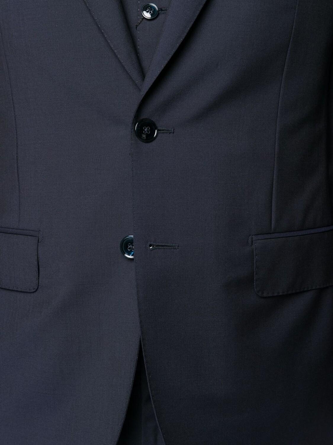 Костюм-тройка строгого кроя от Dell'oglio. Модель без рукавов, застежка на пуговицах спереди, зазубренные лацканы, нагрудный карман, передние карманы с клапанами, длинные рукава, пояс с петлями для ремня и прямые брючины.
