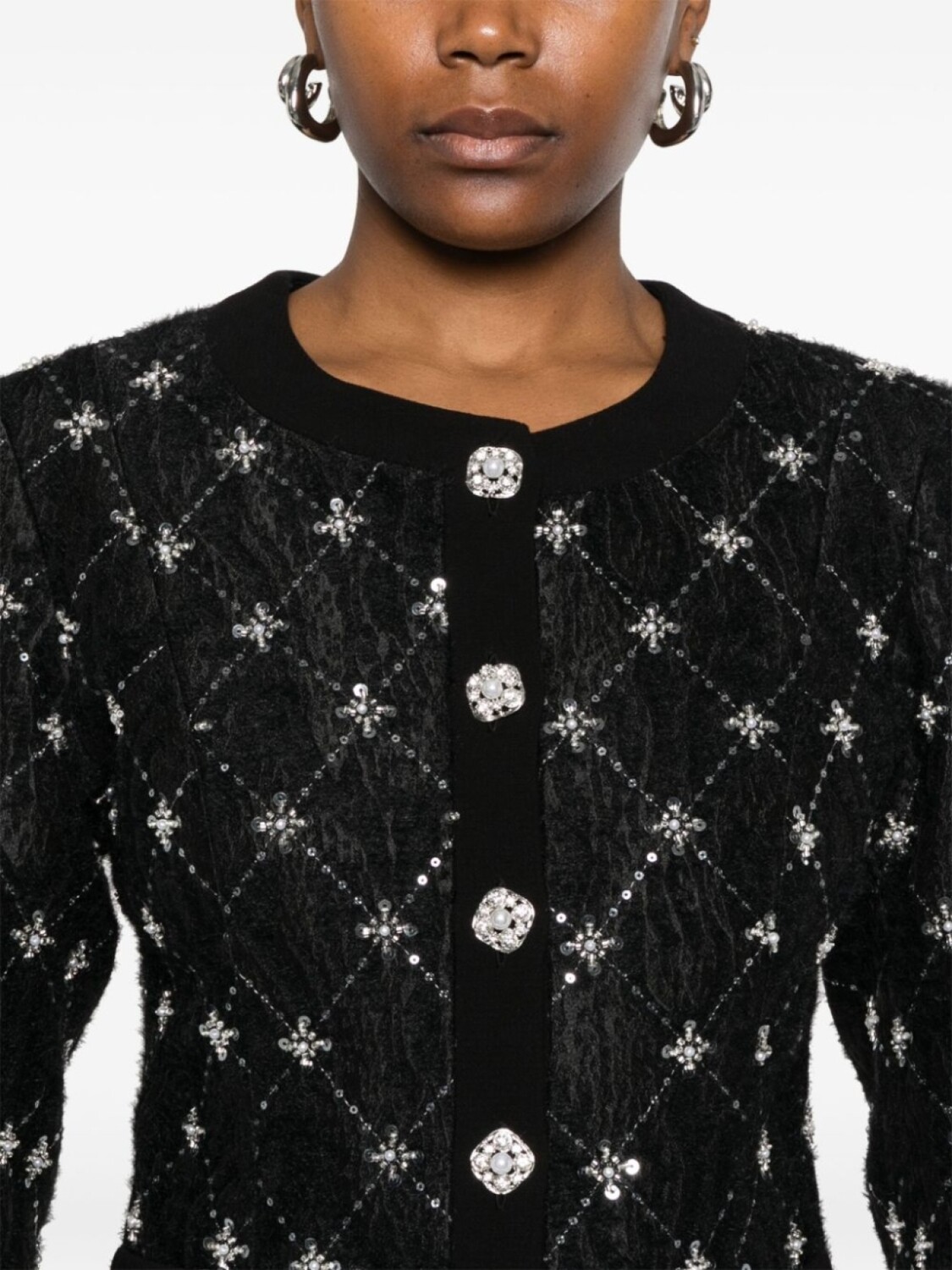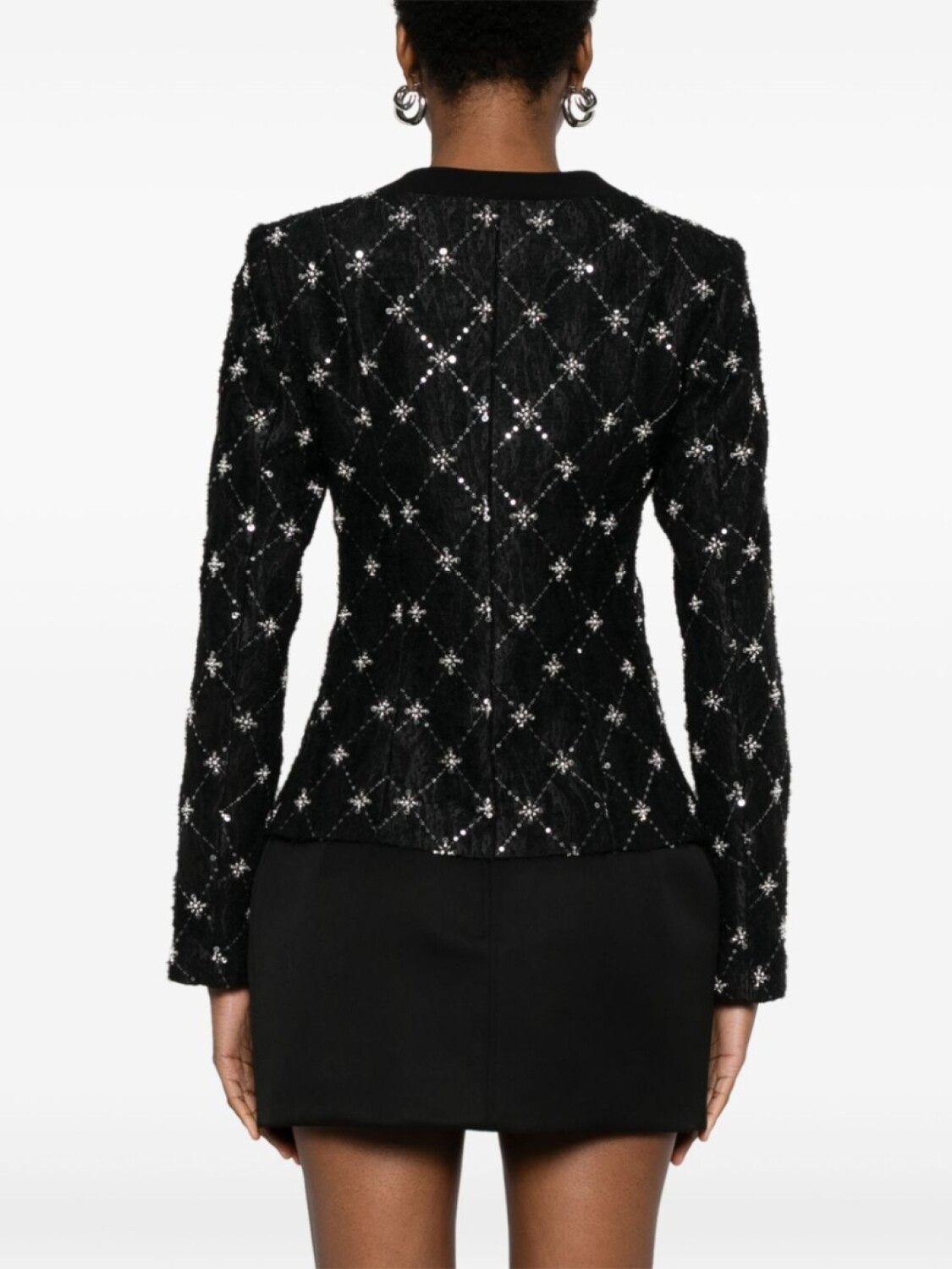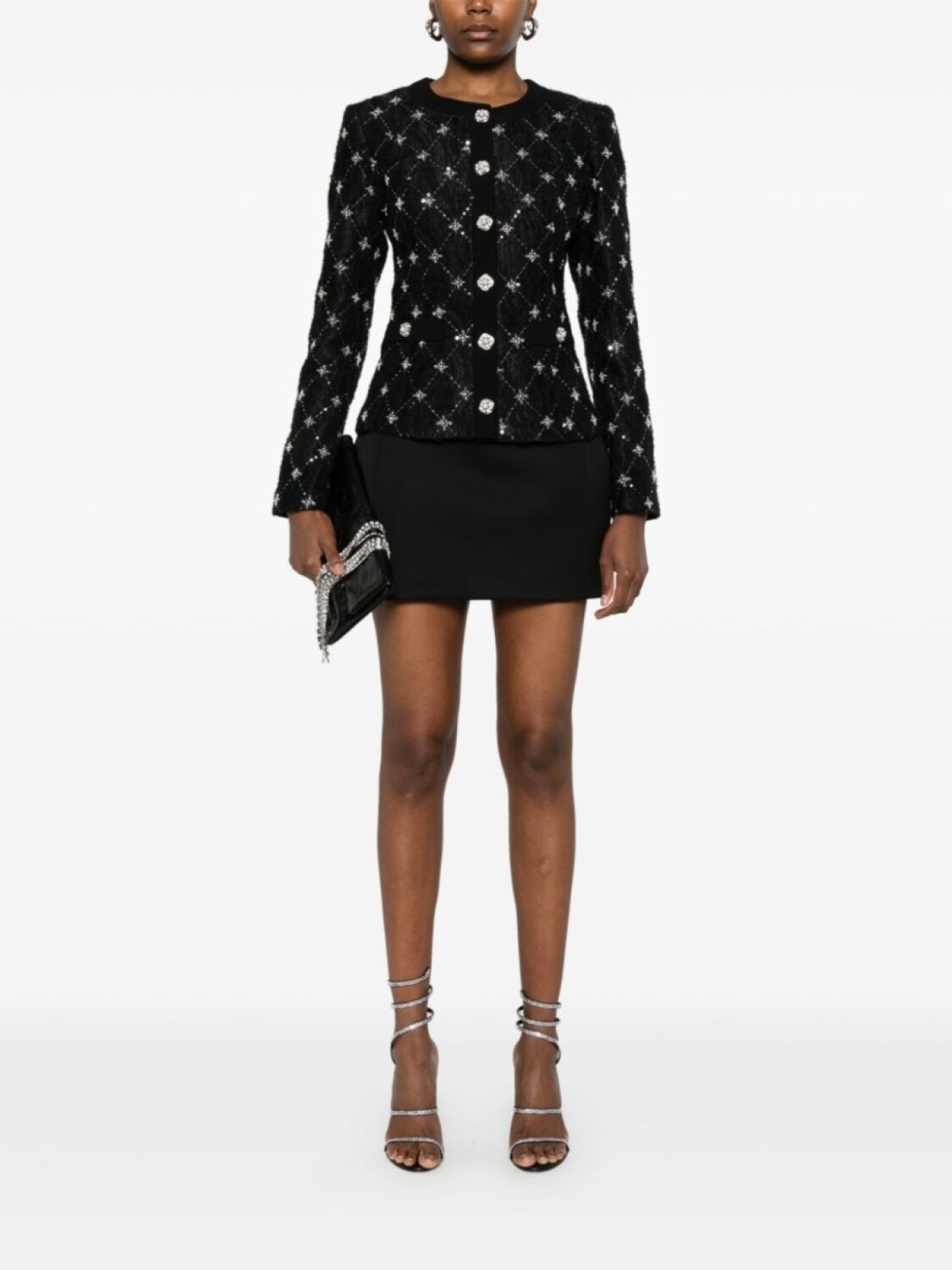 Черная вышивка бисером и пайетками, узорчатый жаккард, застежка на пуговицы спереди, пуговицы, украшенные кристаллами, круглый вырез горловины, без воротника, длинные рукава, два боковых прорезных кармана, подкладка с логотипом и жаккардовым узором, прямой подол
