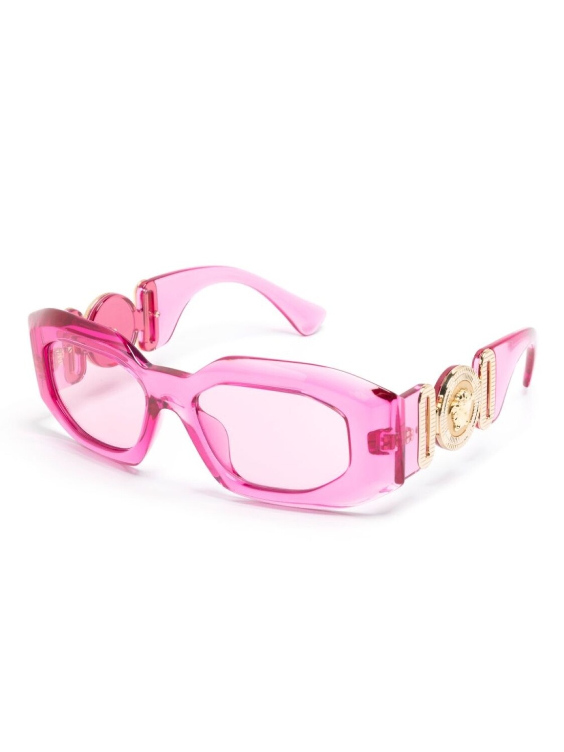 Розовый, ацетат, металл, прозрачный материал, розовые линзы, прямоугольная оправа, декор Medusa, золотистая фурнитура, скульптурные дужки и дужки с закругленными концами. В комплект входит защитный чехол для очков. Обратите внимание, что на FARFETCH продаются оправы с линзами без диоптрий.