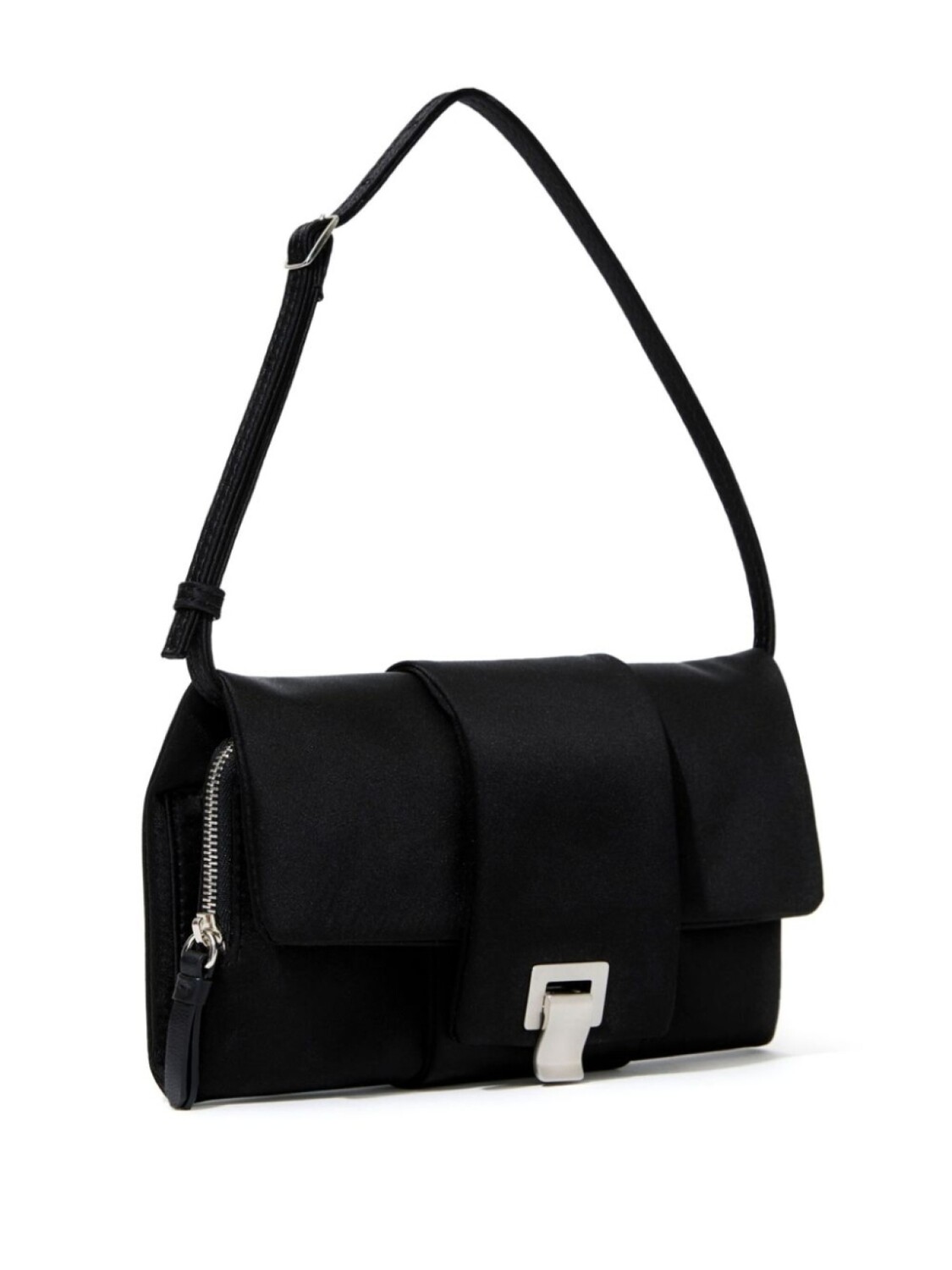 Черный, шелковый атлас, овечья кожа, съемный регулируемый ремень на плечо, откидной верх, серебристая фурнитура, внутренний карман на молнии, внутренний накладной карман