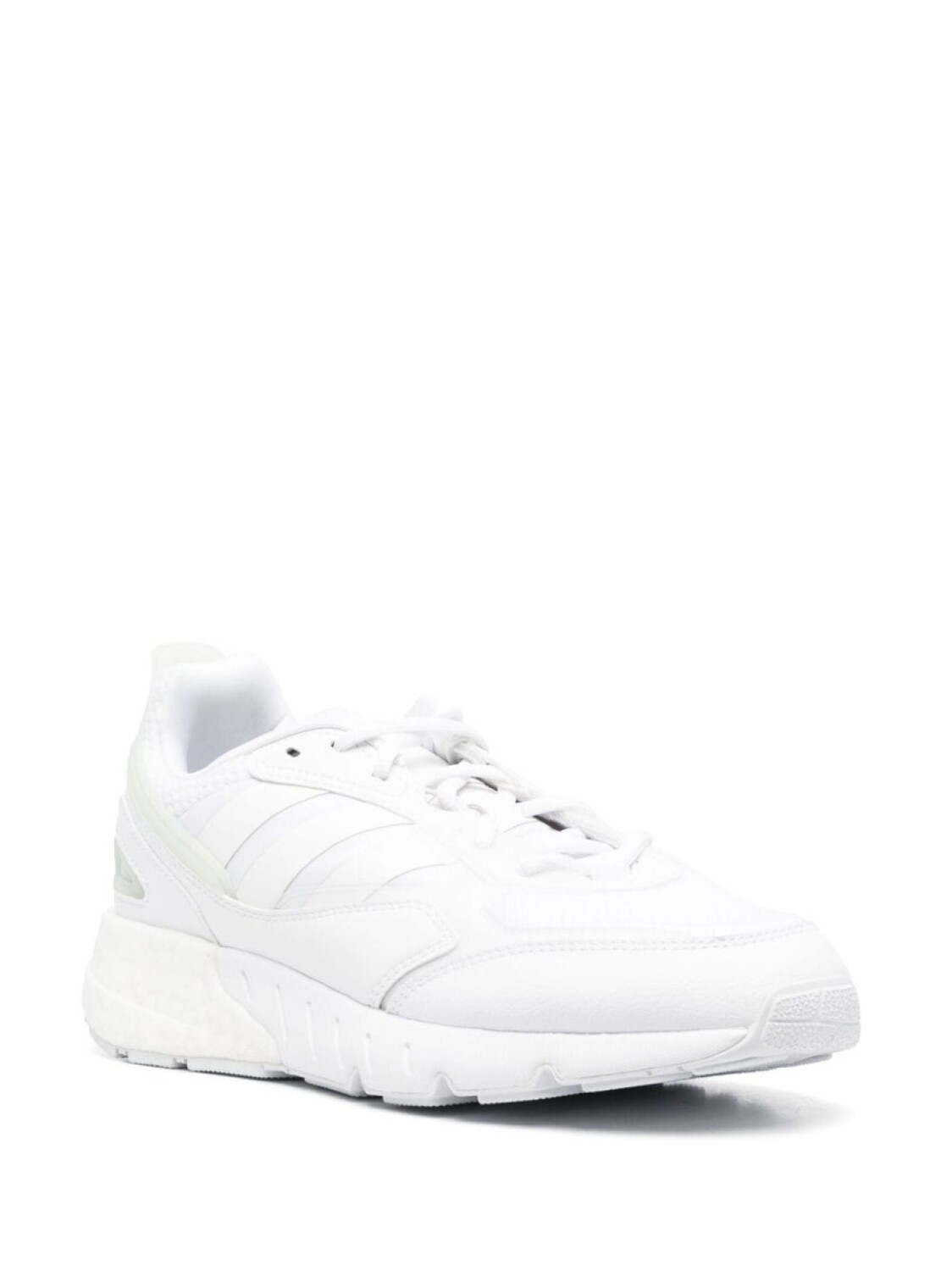 Белый, знаковый логотип 3-Stripes, нашивка с логотипом на язычке, тисненый логотип сзади, шнуровка спереди, миндалевидный носок, стелька с логотипом и резиновая подошва.