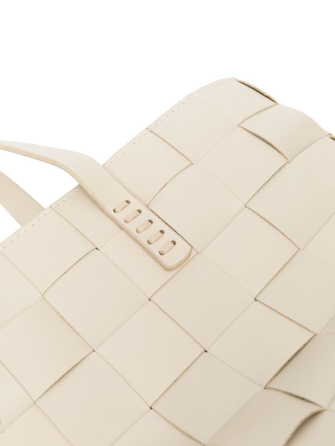 Кремово-белый, телячья кожа, переплетенный дизайн, дизайн с открытым верхом, две верхние ручки, основное отделение, нашивка с логотипом внутри и внутренний карман на молнии.