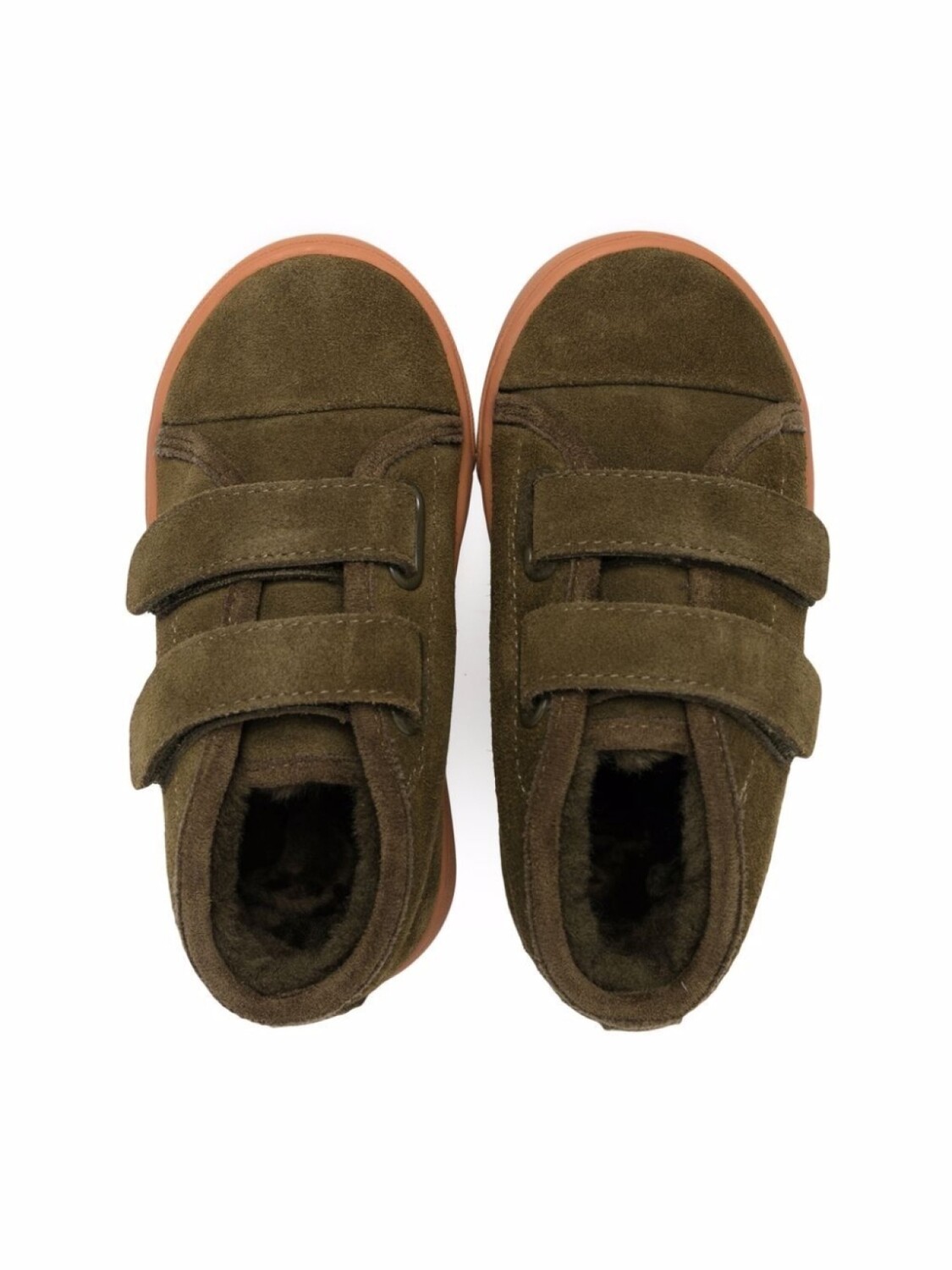 Подкладка из овечьей шерсти, закругленный носок, застежка на липучке спереди и плоская резиновая подошва.