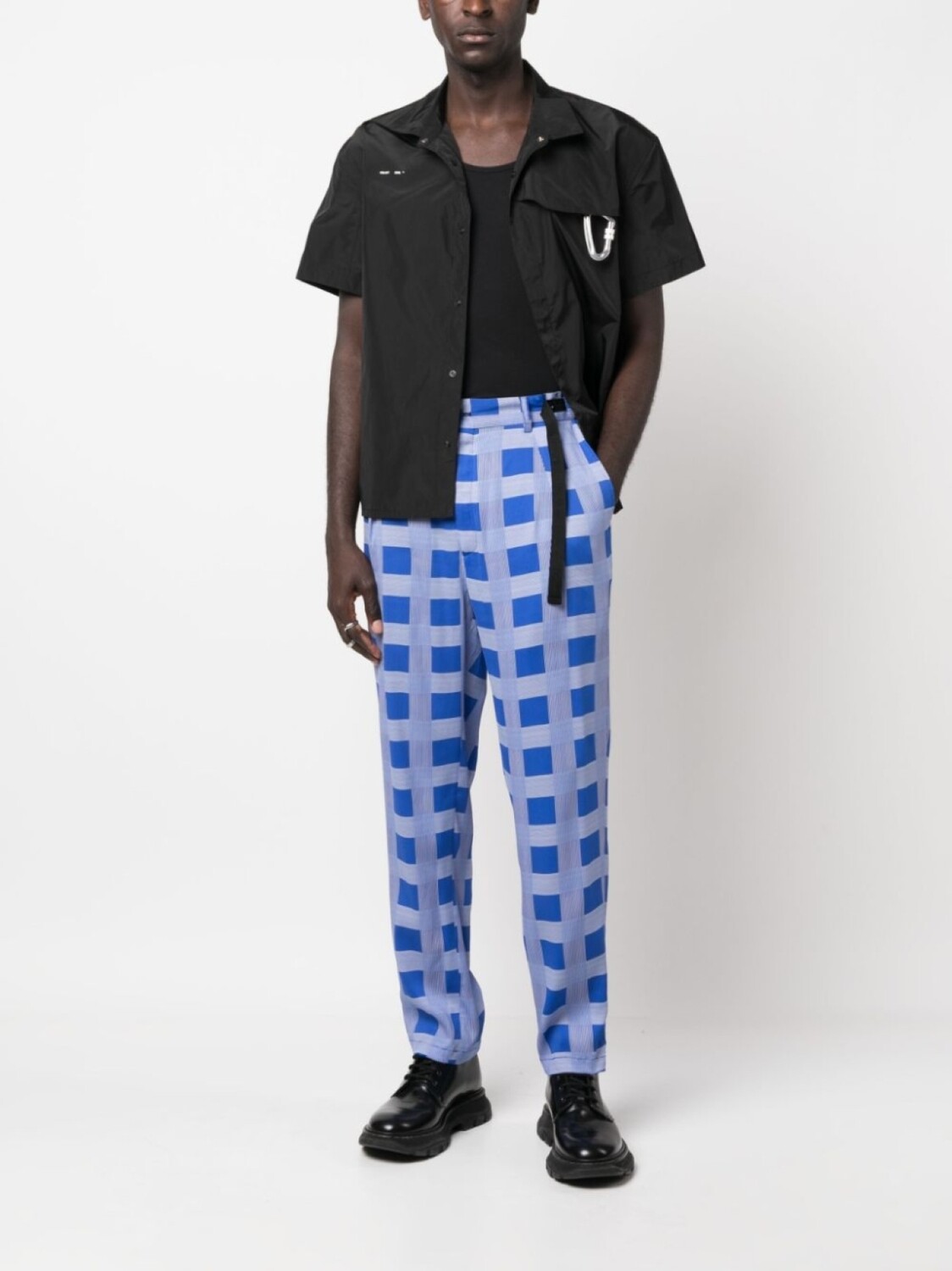 Синий, принт в клетку, складки, петли для ремня, застежка на молнии и пуговице спереди, прямой крой, два вшитых кармана по бокам и накладной карман сзади.