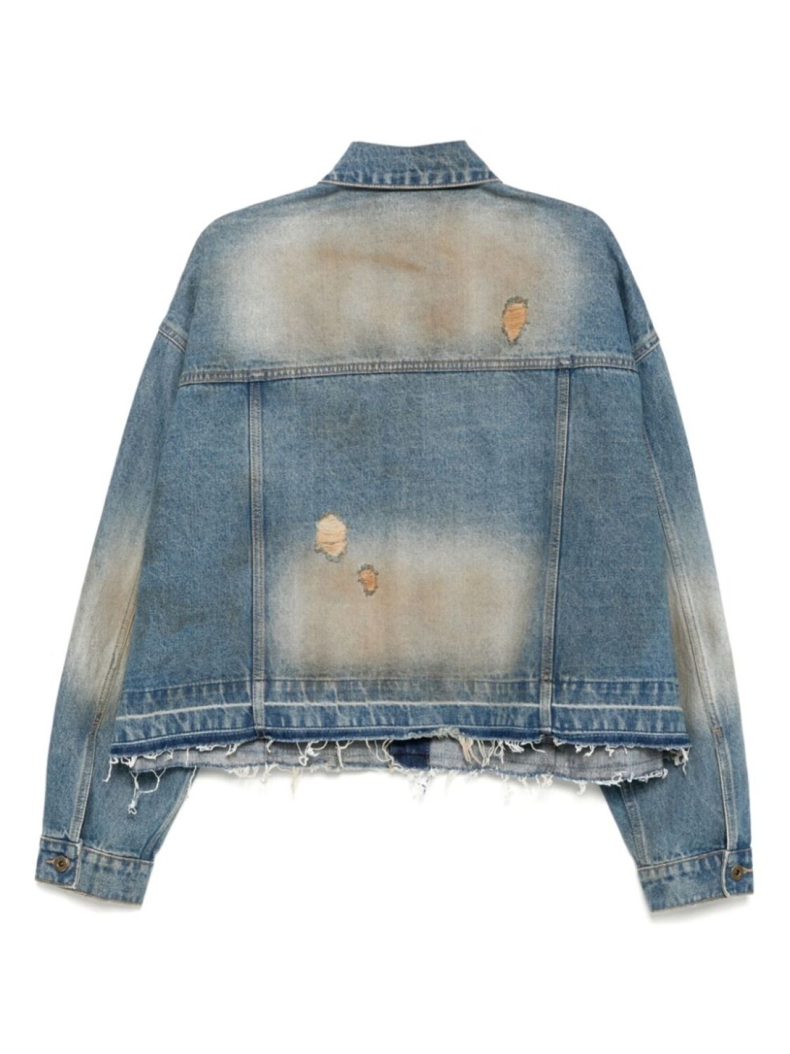Индигово-голубой хлопковый деним с эффектом потертости, застежка на пуговицы спереди, классический воротник, два передних кармана с клапанами, два передних прорезных кармана, манжеты на пуговицах, эффект потертости