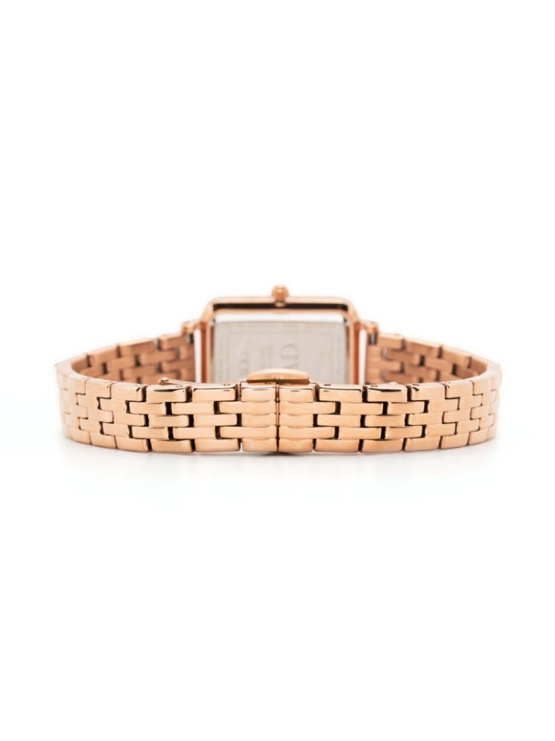Нержавеющая сталь, кварцевый механизм, хрустальные часовые индексы, перламутровый циферблат, прямоугольный корпус, регулируемый браслет со звеньями, потайная застежка и водонепроницаемость до 30 метров/3 АТМ.