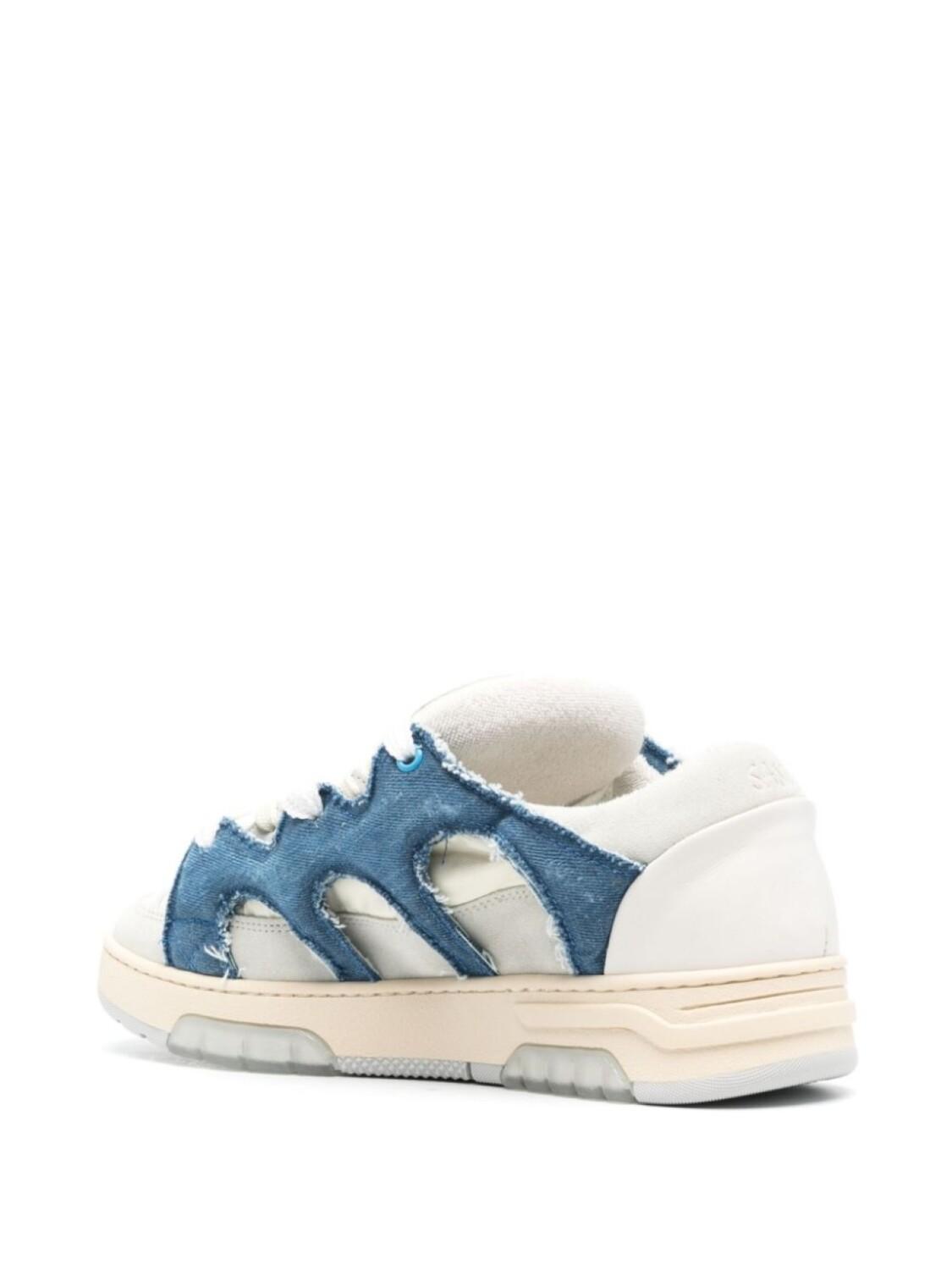 Серый/индиго/светло-желтый, телячья кожа, замшевые вставки, вставки из денима, дутый материал, дизайн со вставками, перфорация, эффект потертости, тисненый логотип на язычке, тисненый логотип сзади, логотип на подошве, закругленный носок, двойная шнуровка спереди, махровая подкладка, кожаная стелька с логотипом, плоская резиновая подошва