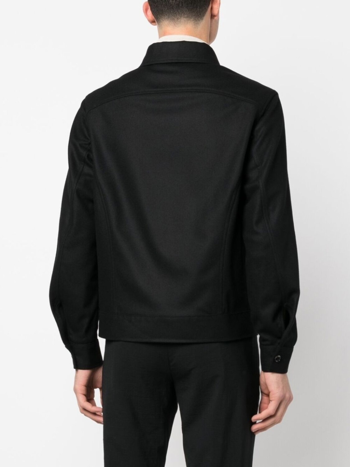 Черный, смесь шерсти и хлопка, классический воротник, застежка на пуговицах спереди, длинные рукава, два нагрудных кармана с клапанами и прямой подол.