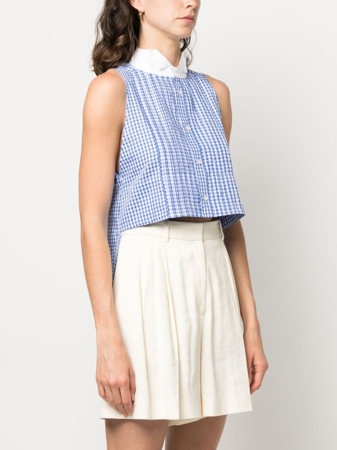 Синий/белый, хлопок, клетка гингем, вставка со сборками, необработанные края, воротник-стойка, застежка на пуговицах спереди, без рукавов и неравномерный подол.