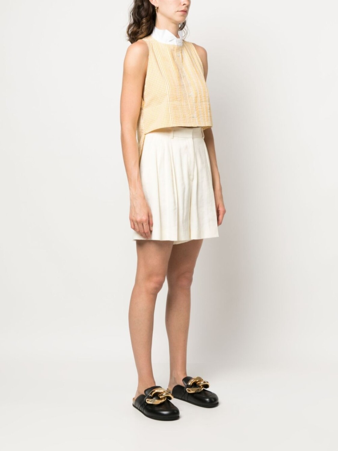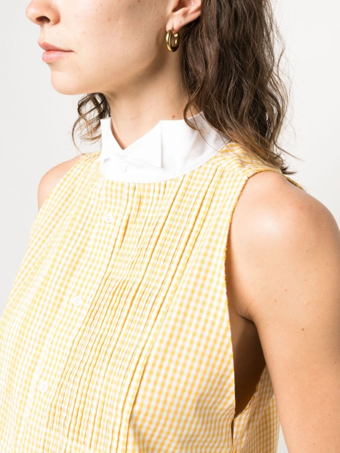 Желтый, белый, хлопок, клетка гингем, вставка со сборками, необработанные края, воротник-стойка, застежка на пуговицах спереди, без рукавов и неравномерный подол.