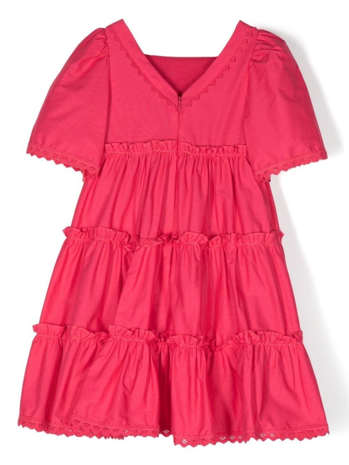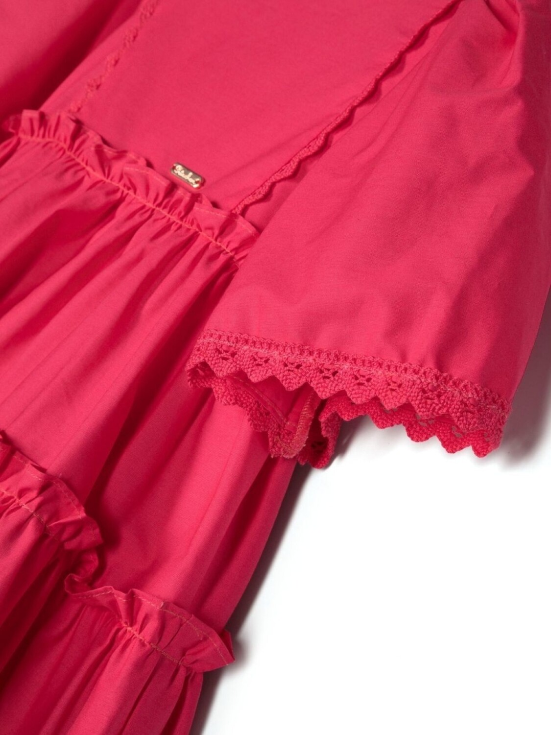 Фуксия, хлопок, вставки с оборками, отделка в технике кроше, маленькая подвеска с логотипом, края с фестонами, ярусная юбка, квадратный вырез, V-образный вырез сзади, потайная застежка на молнии сзади и короткие рукава.