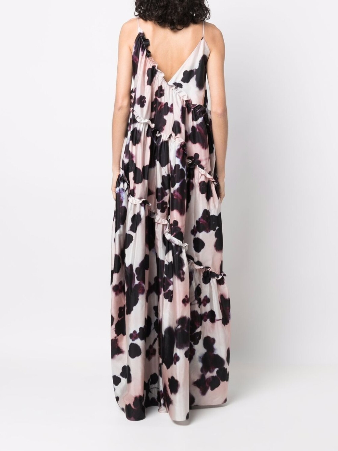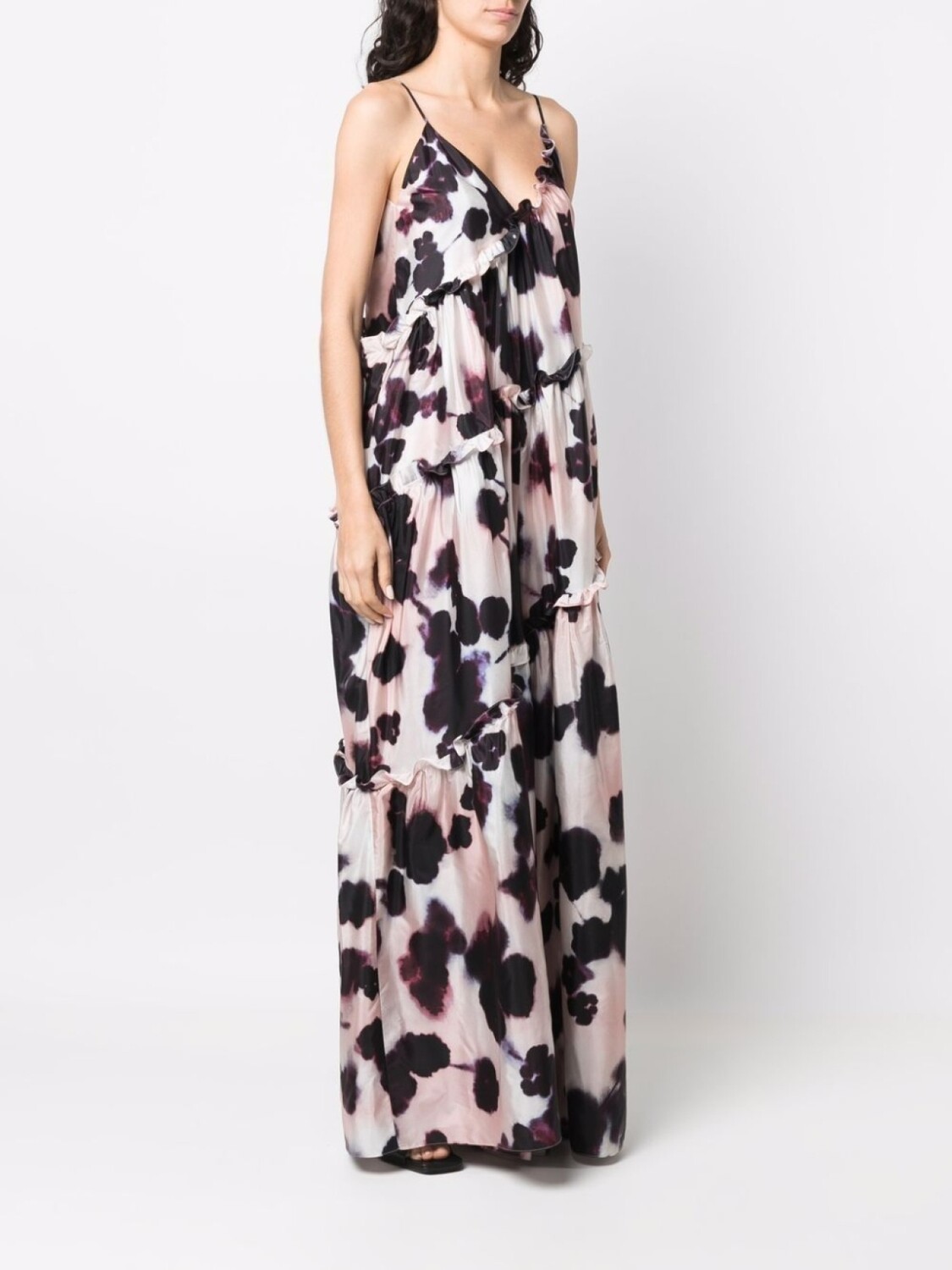 Сплошной графичный принт, вставки с оборками, V-образный вырез и тонкие бретели.