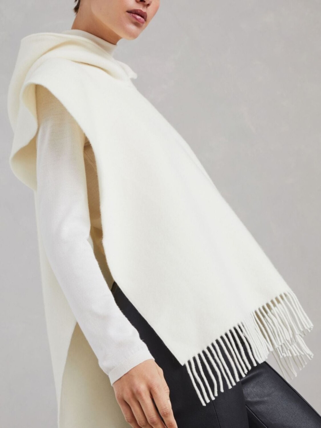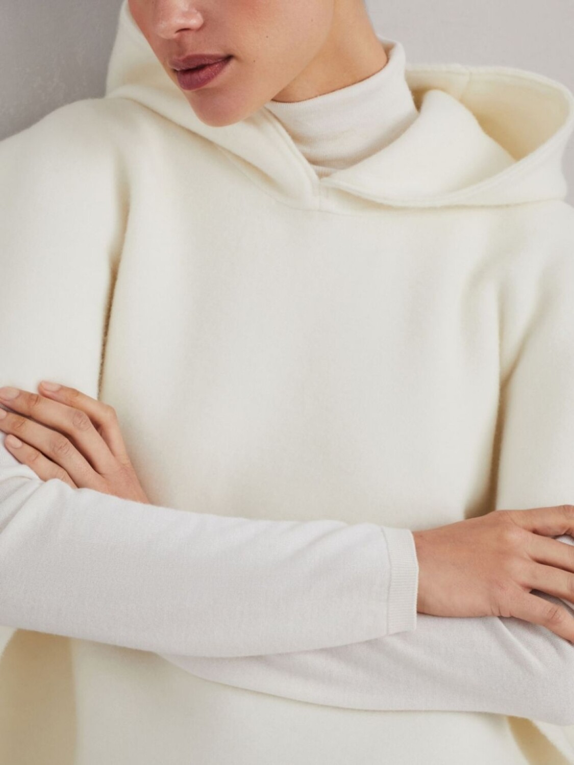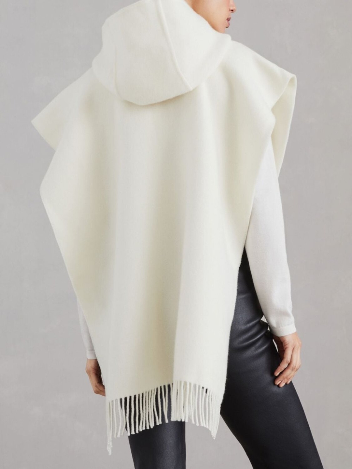 Белый, шерсть, тонкая вязка, без застежки, классический капюшон, рукава кап, кейп, бахрома, прямой подол