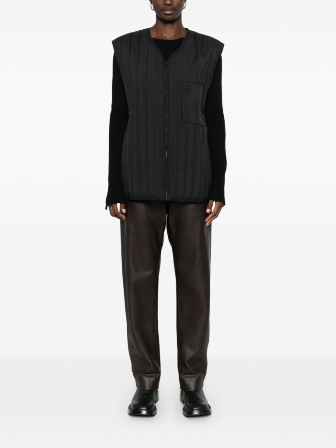 Черный, застежка на молнии спереди, V-образный вырез, стеганная модель, нагрудный карман на молнии, без рукавов, два прорезных кармана по бокам, прямой подол