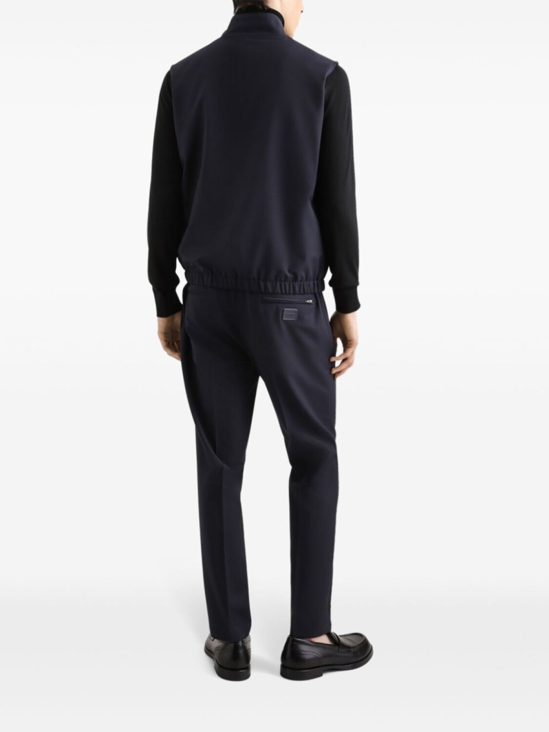Темно-синий эластичный пояс с внутренним шнурком, два боковых кармана на молнии, задний карман на молнии, нашивка с логотипом сзади