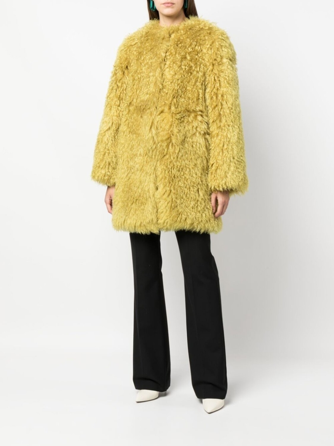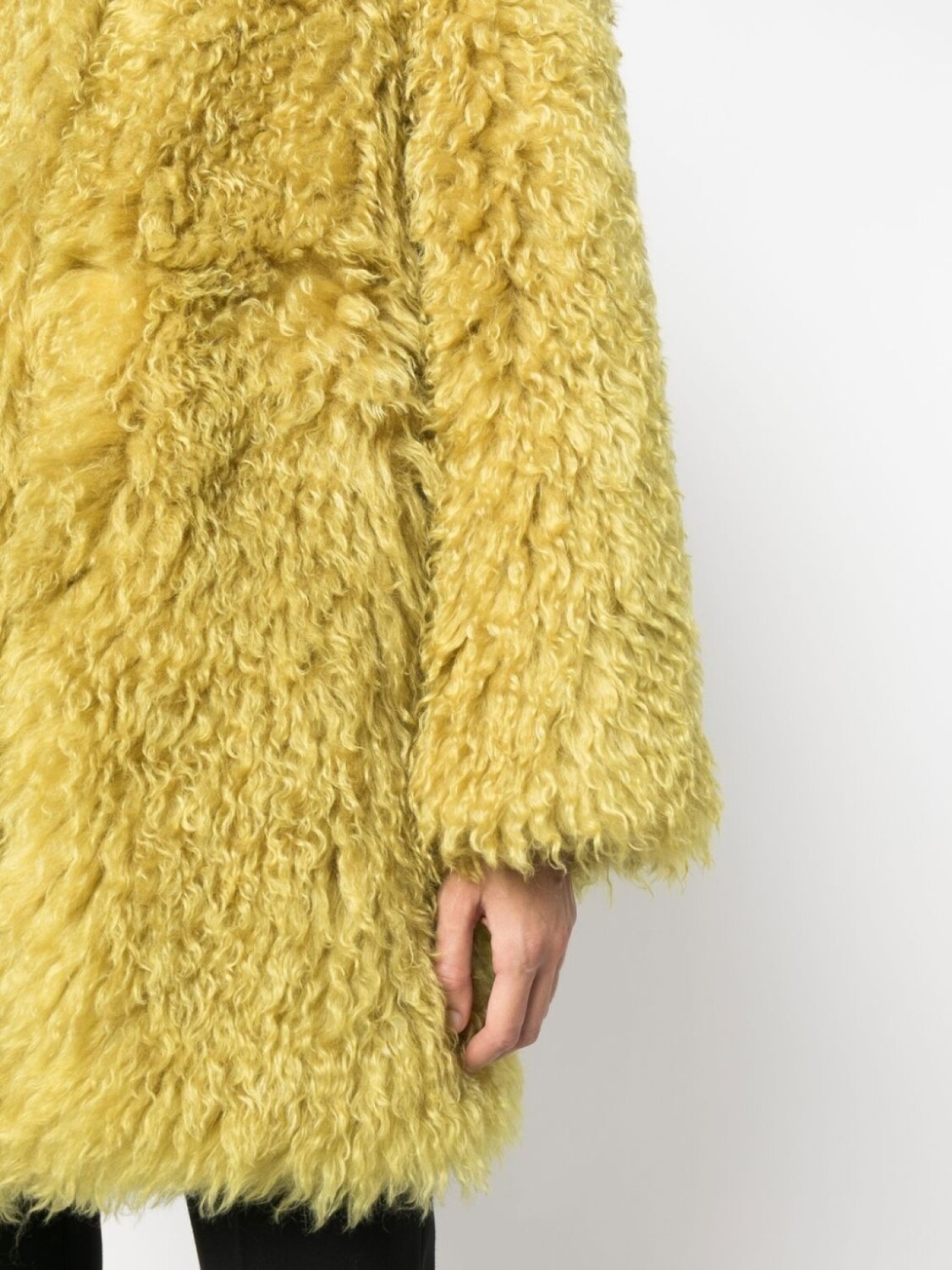 Горчично-желтый, смесь мохера и шерсти, матовый эффект, круглый вырез, потайная застежка спереди и длинные рукава.