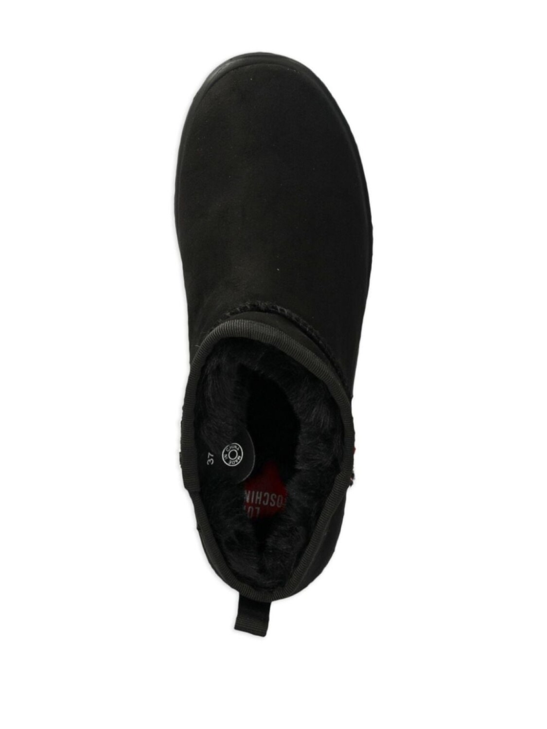 Черная овчина, логотип сбоку, удобная застежка-липучка на пятке, круглый носок, фирменная стелька, плоская резиновая подошва