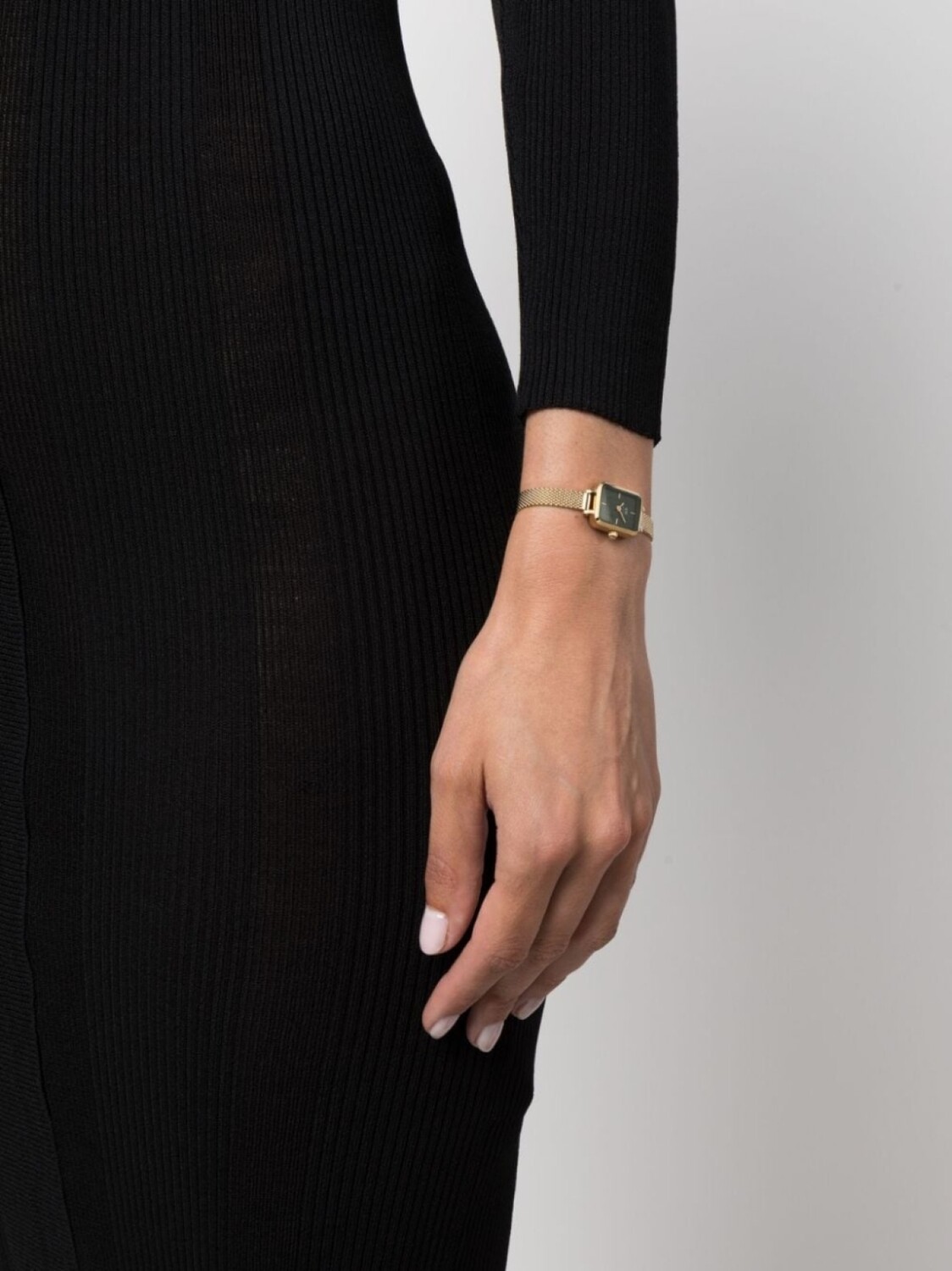 Темно-зеленый, золотистый, нержавеющая сталь, прямоугольный корпус, циферблат с индексами, прямоугольные вытянутые стрелки, завинчивающаяся заводная коронка, плетеный браслет, застежка-клипса и кварцевый механизм. На этот товар распространяется стандартная годовая гарантия от бутика.