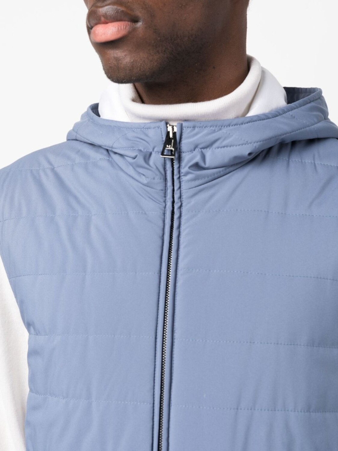 Голубой, хлопок, дутый материал, стеганая модель, застежка на молнии спереди, классический капюшон и два кармана на молнии по бокам.