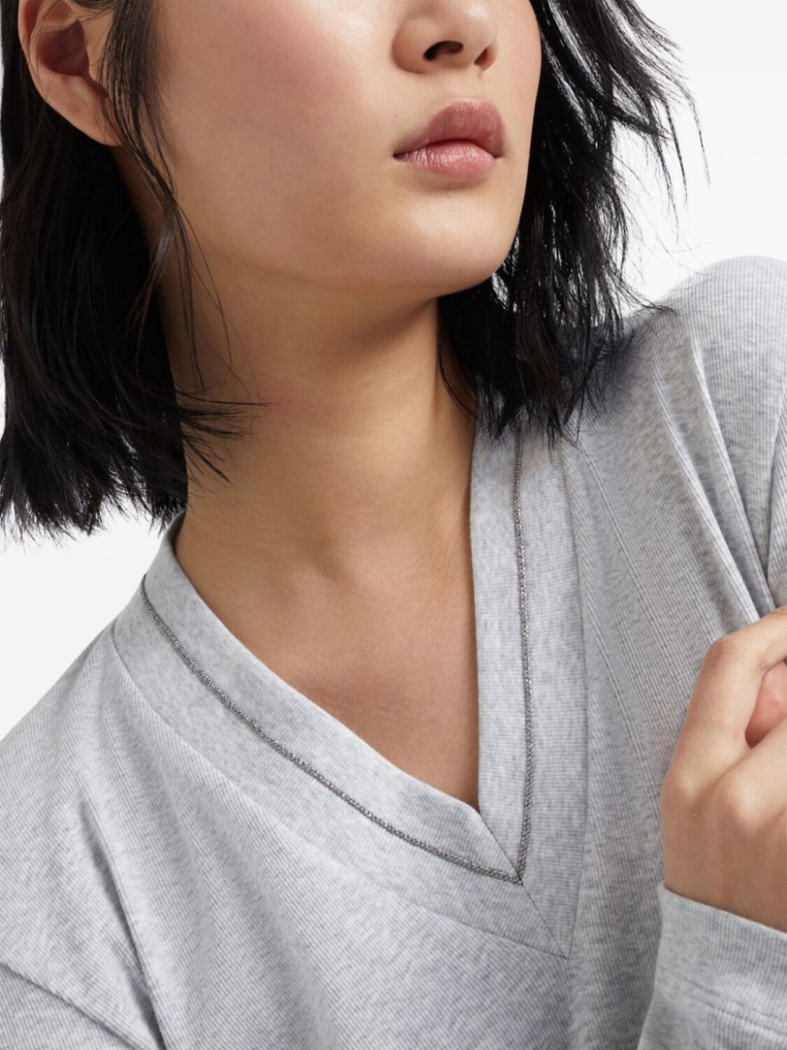 Светло-серый, эластичный хлопок, ткань джерси, знаковая отделка Monili, V-образный вырез, длинные рукава, прямой подол