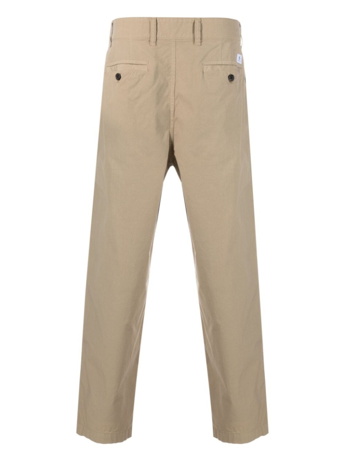 Бежевый, эластичный хлопок, нашивка с логотипом сзади, средняя посадка, петли для ремня, потайная застежка на молнии и пуговицах, два вшитых кармана по бокам, два кармана на пуговице сзади и прямой крой.
