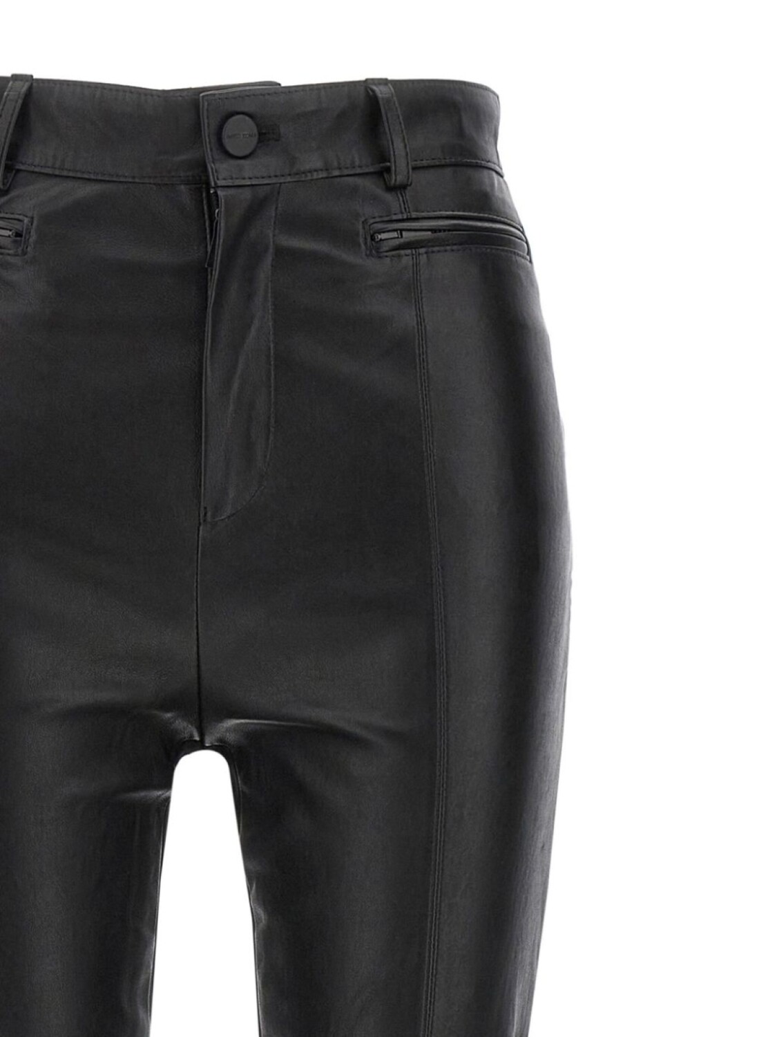 Черная потайная застежка на пуговицы и ширинку, шлевки для ремня, два боковых кармана на молнии, молнии на щиколотках