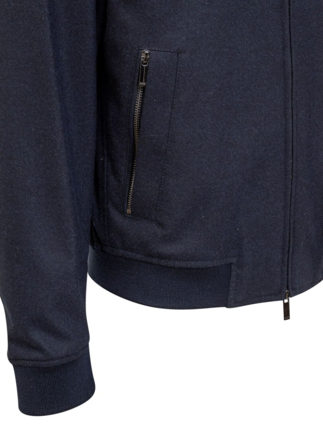 Темно-синяя текстурированная отделка, застежка-молния с двумя бегунками спереди, воротник-бейсболка, длинные рукава, ребристые манжеты и подол, два боковых кармана на молнии