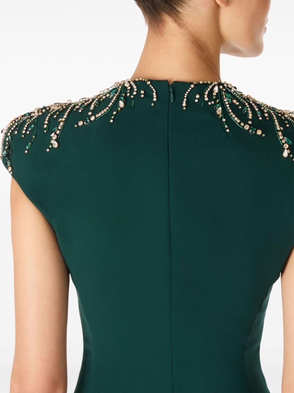 Зеленый, кристаллы, застежка на молнии сзади, V-образный вырез, короткие рукава, прямой подол