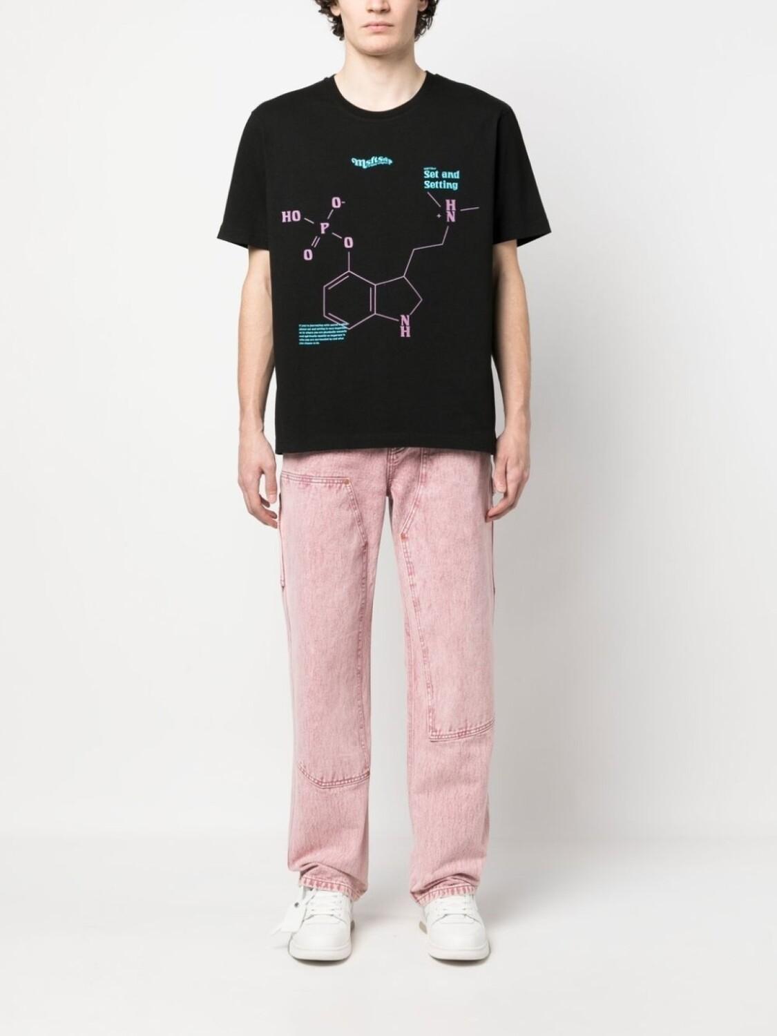 Черный, сине-зеленый, темно-розовый, хлопок, ткань джерси, графичный принт спереди, текстовый принт, круглый вырез, короткие рукава и прямой подол.