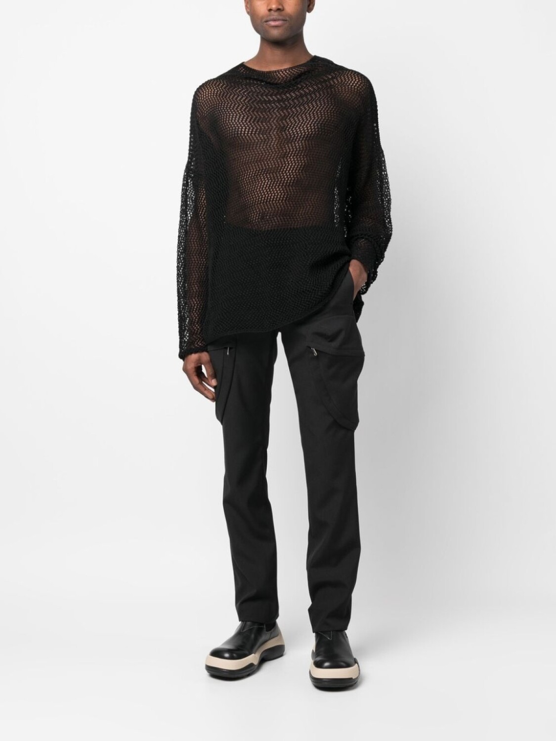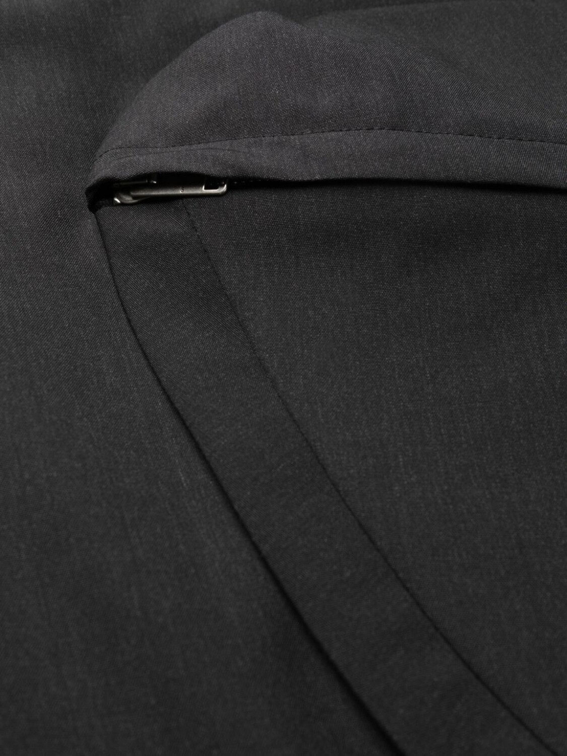 Древесный уголь, смесь шерсти и хлопка, два кармана на молнии по бокам, передний карман с клапаном, задние карманы с листочкой, потайная молния спереди, петли для ремня, завышенная талия и узкий крой.