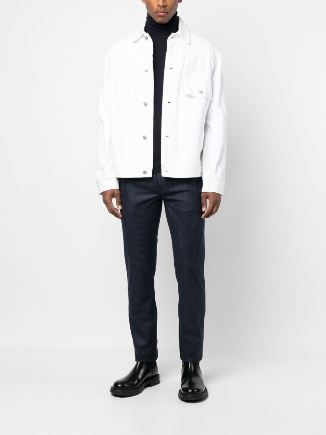 Темно-синий, необработанная шерсть, клетчатый узор, нашивка с логотипом сзади, застежка на молнии и пуговице спереди, прорезные карманы по бокам, два накладных кармана сзади и прямой крой.