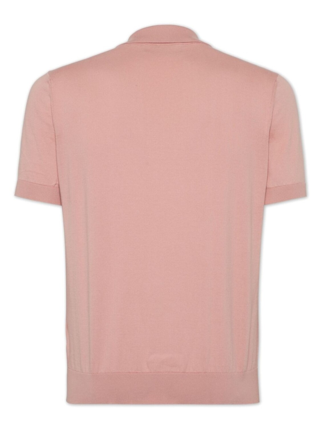 Пудрово-розовый хлопок, тонкий трикотаж, застежка на пуговицы спереди, воротник-поло, короткие рукава, вышитый логотип на груди, ребристый край, прямой подол