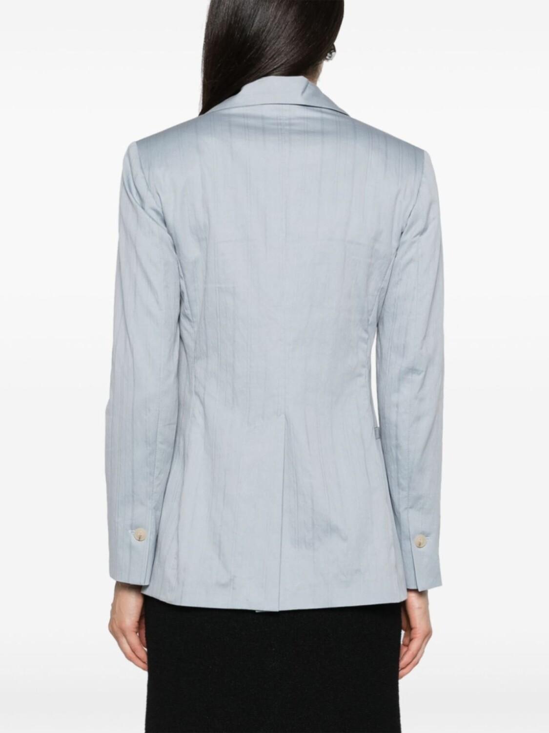 Голубой, смесь хлопка и льна, зазубренные лацканы, застежка на пуговицах спереди, длинные рукава с манжетами на пуговицах, три передних кармана с листочкой, шлица по центру сзади, прямой подол, частичная подкладка