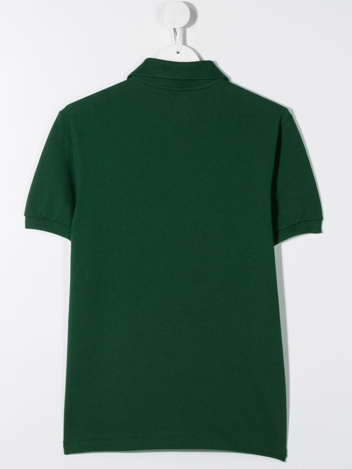 Однотонная рубашка-поло от Lacoste Kids. Классический воротник-поло, короткие рукава, застежка на пуговицы и контрастный вышитый логотип на груди. Цвет: зеленый.